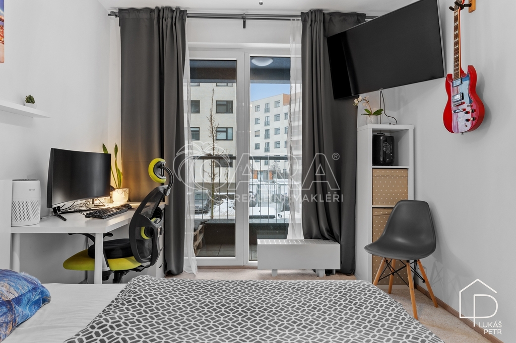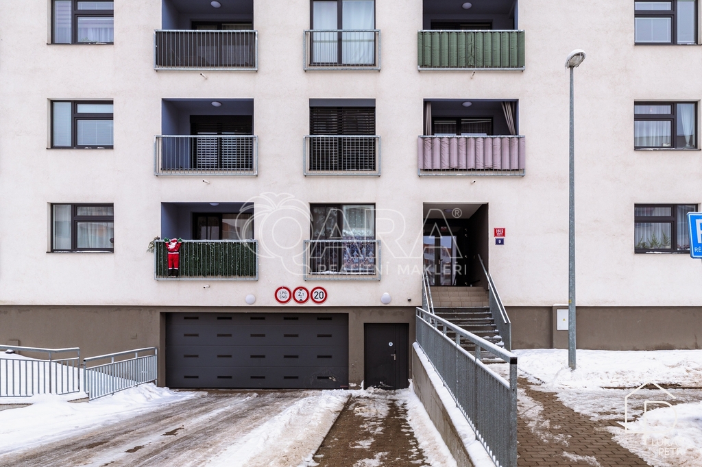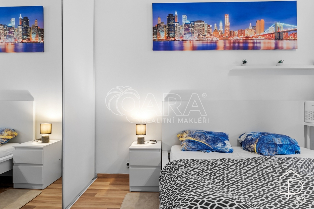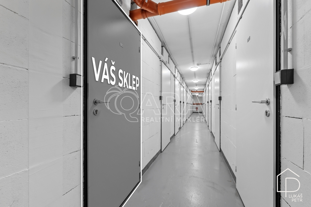 Podlahová plocha je 51,7 m2. Dispozice je přesně taková, jaká má u 2+kk být – obývací pokoj s kuchyňským koutem, samostatná ložnice, koupelna s WC a komora přímo v bytě. Úložné prostory jsou řešené nejen sklepem, ale i komorou, která v podobných dispozicích často chybí. Stav bytu je výborný.