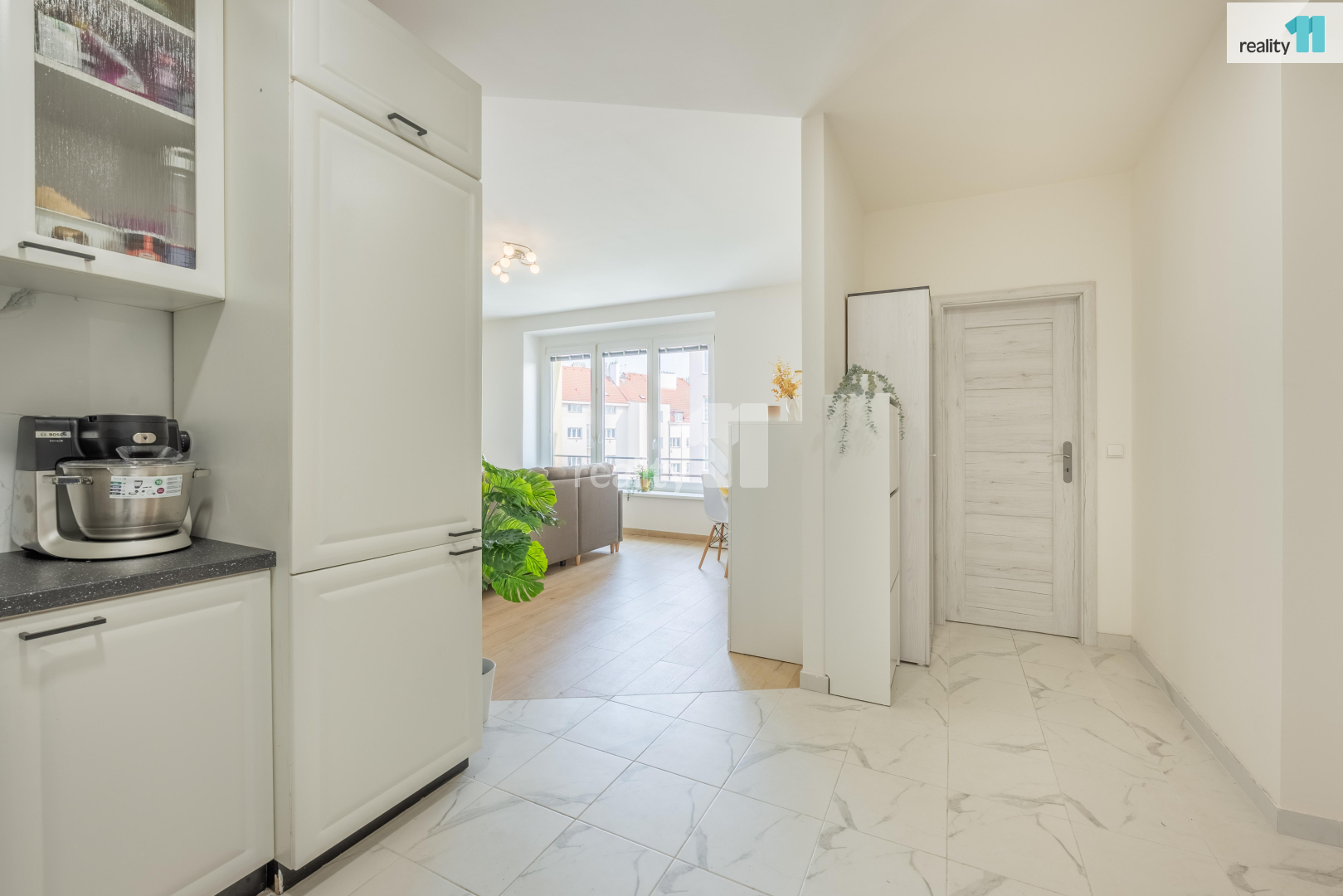 Byt dostal novou dispozici: novou předsíň s kuchyňským koutem s kuchyňskou linkou s vestavěnou lednicí, myčkou a plynovým sporákem, obývací pokoj, ložnici, koupelnu a samostatné WC. Vznikl tak vzdušný, otevřený prostor, interiér působí svěže a nadčasově. Světlé tóny a promyšlené řešení vytváří příjemnou atmosféru. Kuchyňská linka v bílém provedení působí elegantně a snadno ji sladíte s vlastním stylem.