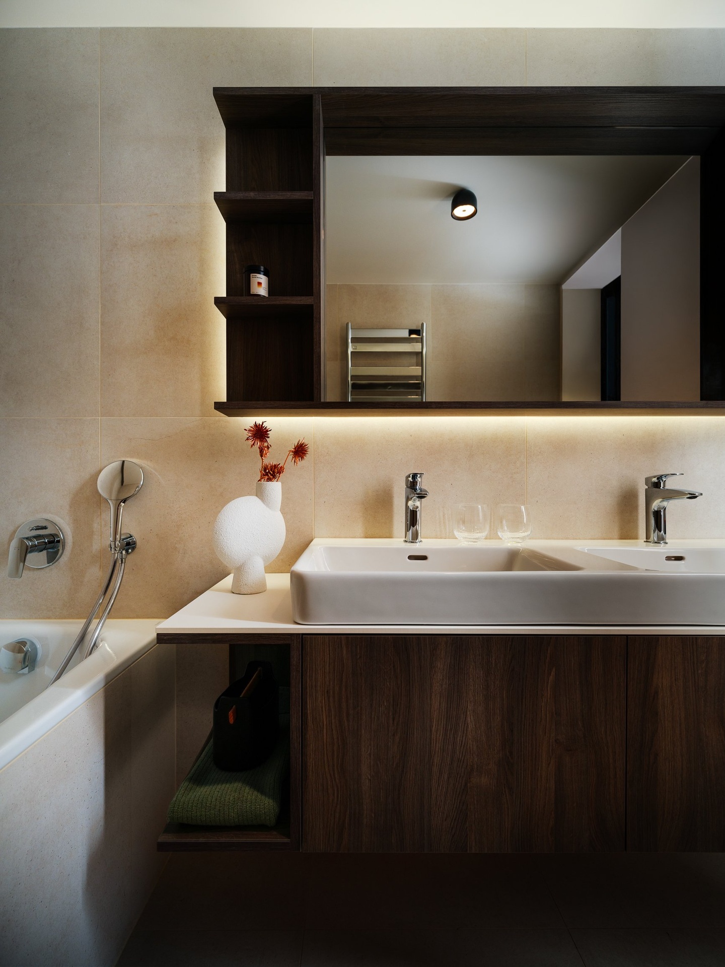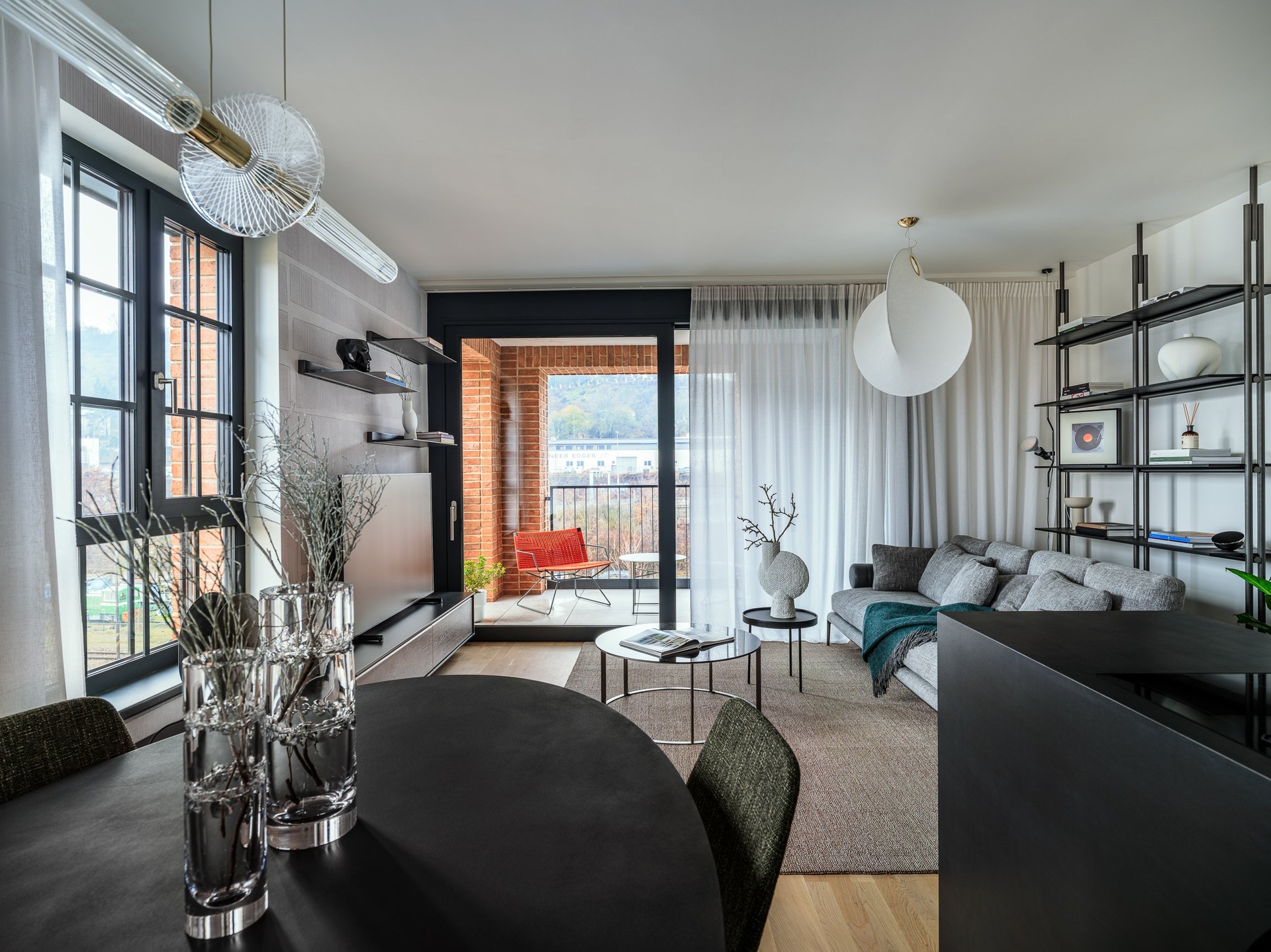 O pohodlí se starají moderní technologie – rekuperace, stropní chlazení, exteriérové žaluzie či izolační trojskla. Vše je řízeno chytrým systémem Loxone, který zajišťuje příjemné a úsporné bydlení v každém ročním období.