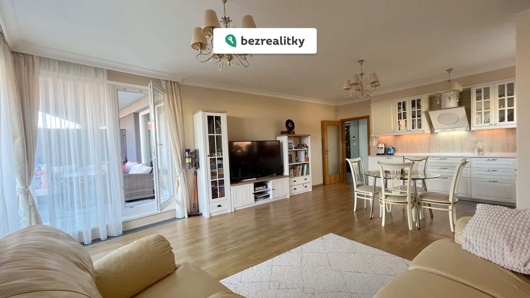 Dominantou bytu je prostorný obývací pokoj 33 m² s moderním kuchyňským koutem a francouzskými okny až k podlaze, které zajišťují dostatek denního světla po celý den.