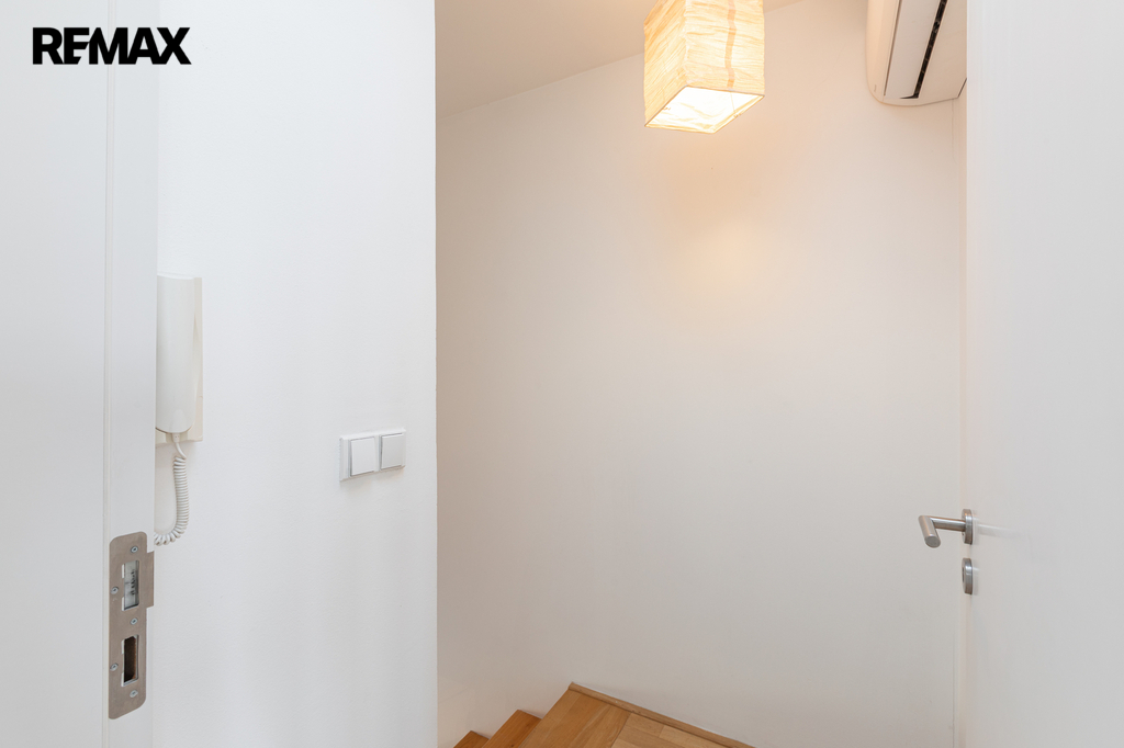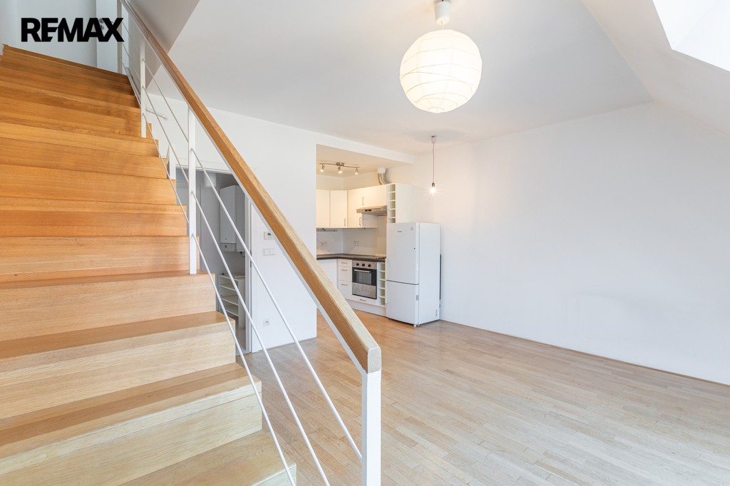 Byt je řešen jako mezonet. Ve spodním patře se nachází vstupní chodba, obývací pokoj s kuchyňským koutem a samostatné WC. Po dřevěném vnitřním schodišti se vstupuje do horního patra, které slouží jako klidová zóna – zde je umístěna ložnice a prostorná koupelna s vanou a WC. Byt je orientován na východní a západní stranu, díky čemuž je příjemně prosvětlený po celý den. Součástí vybavení je klimatizace, která zvyšuje komfort bydlení zejména v letních měsících. Byt má nízké provozní náklady.