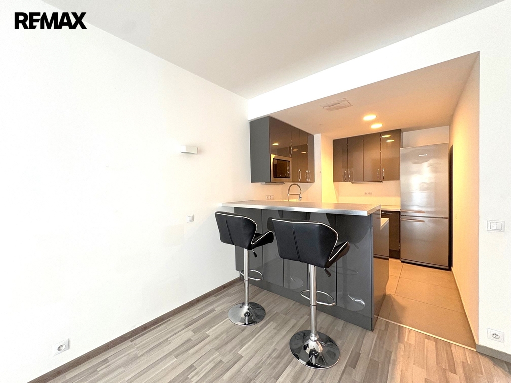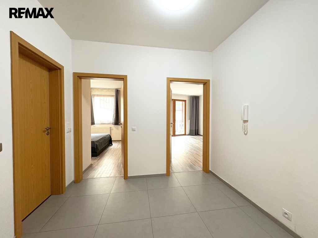 Interiér bytu je tvořen vstupní předsíní, velkým obývacím pokojem se vstupem na terasu a s kuchyňským koutem s moderní kuchyňskou linkou s vestavěnými spotřebiči (sklokeramická varná deska, digestoř, elektrická trouba, mikrovlnná trouba, myčka nádobí, lednice s mrazákem), dále 2. pokojem s vestavěnou skříní, koupelnu se zděným sprchovým koutem a samostatnou toaletou.