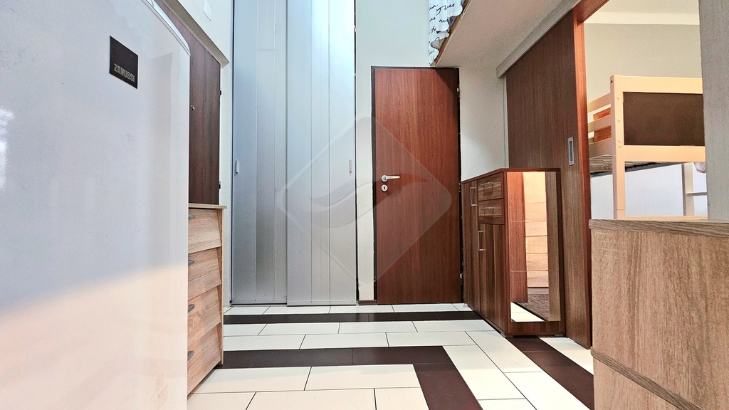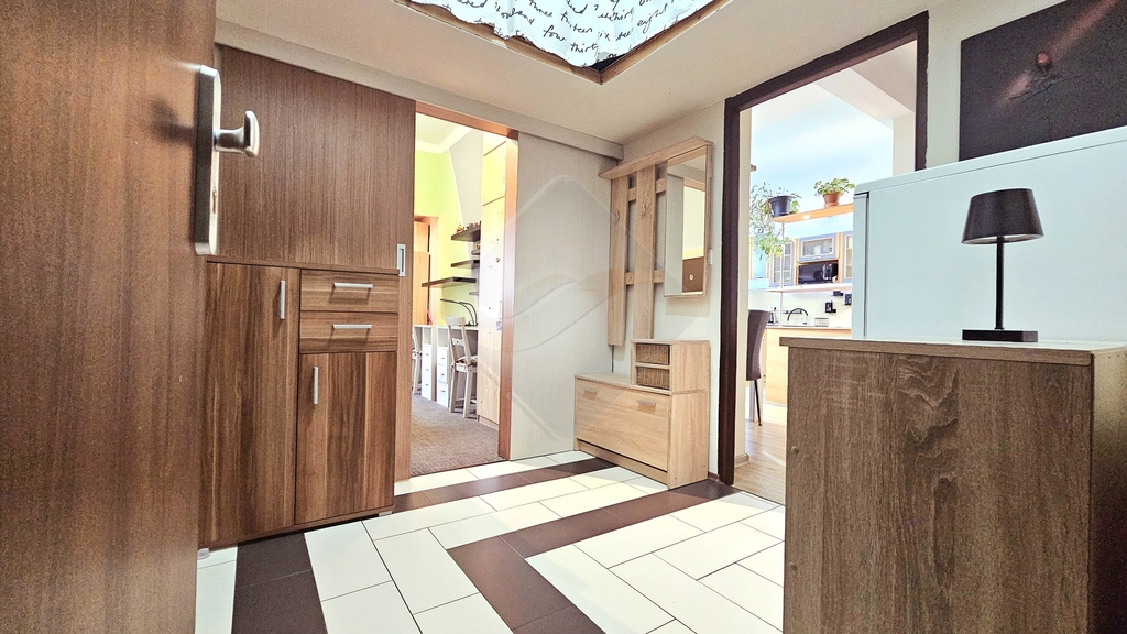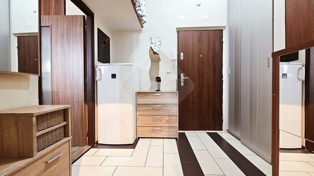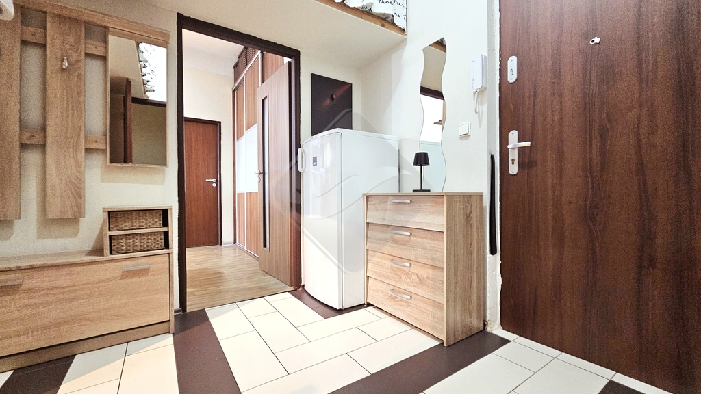 Interiér bytu je navržen s důrazem na maximalizaci úložných prostor, což zajišťuje komfortní a praktické užívání.