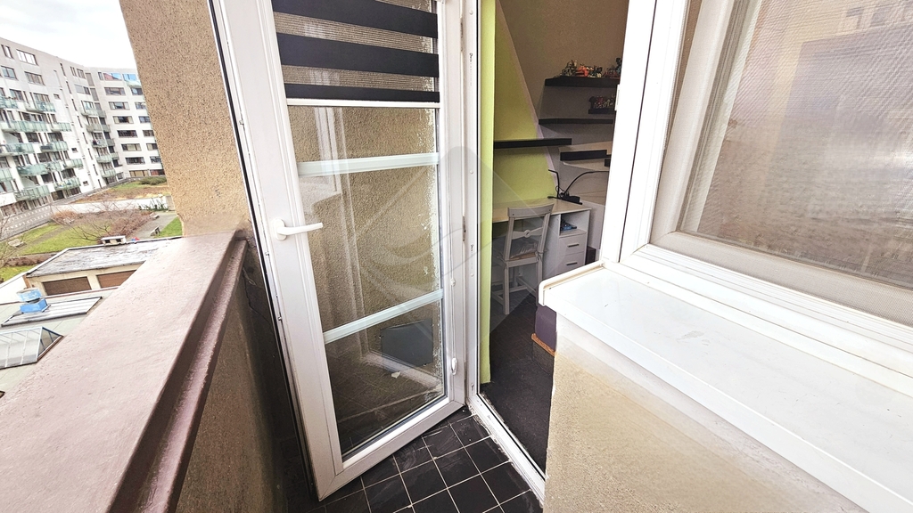 Dispozice zahrnuje prostorný obývací pokoj s kuchyňským koutem a velkou vestavěnou skříní, samostatnou ložnici s přímým vstupem na balkon, předsíň, koupelnu s vanou a oddělenou toaletu.