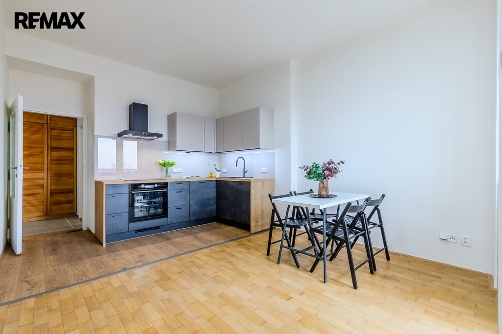 Jeho dominantou je světlý obývací prostor s kuchyňským koutem a jídelní částí (cca 15,3 m²). Moderní kuchyňská linka je zpracována v nadčasovém designu a nabízí dostatek pracovního i úložného prostoru.