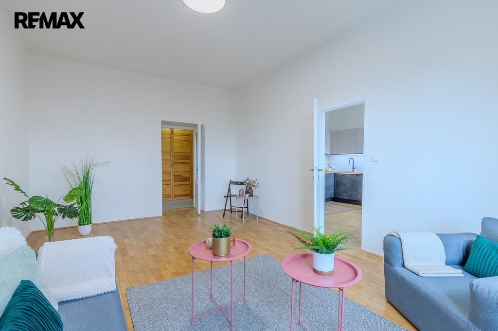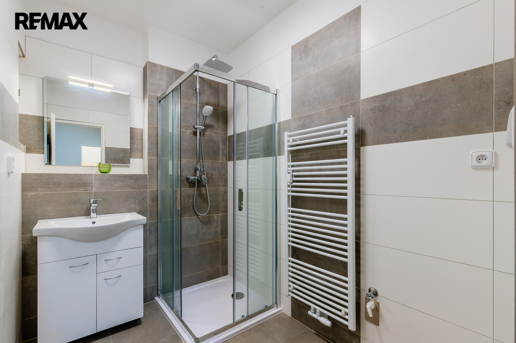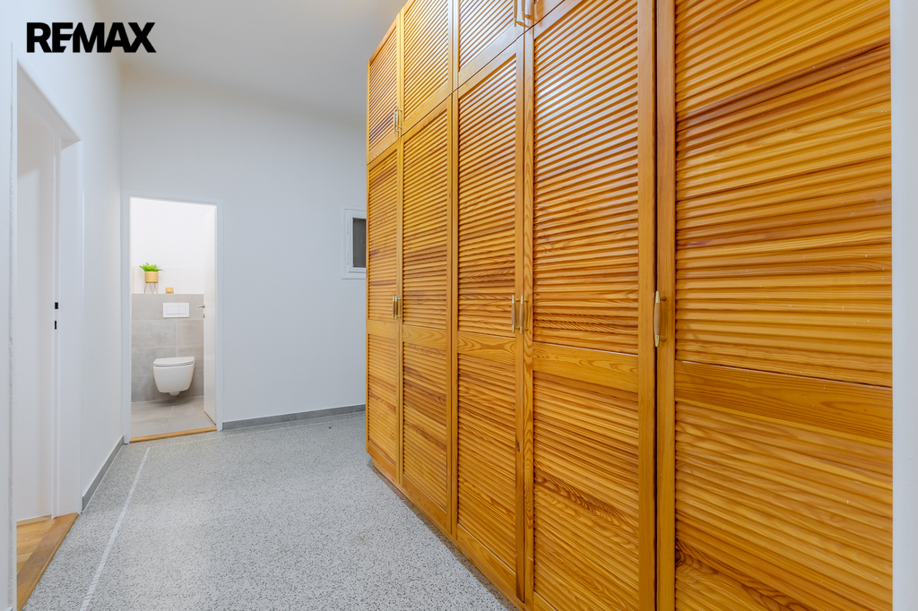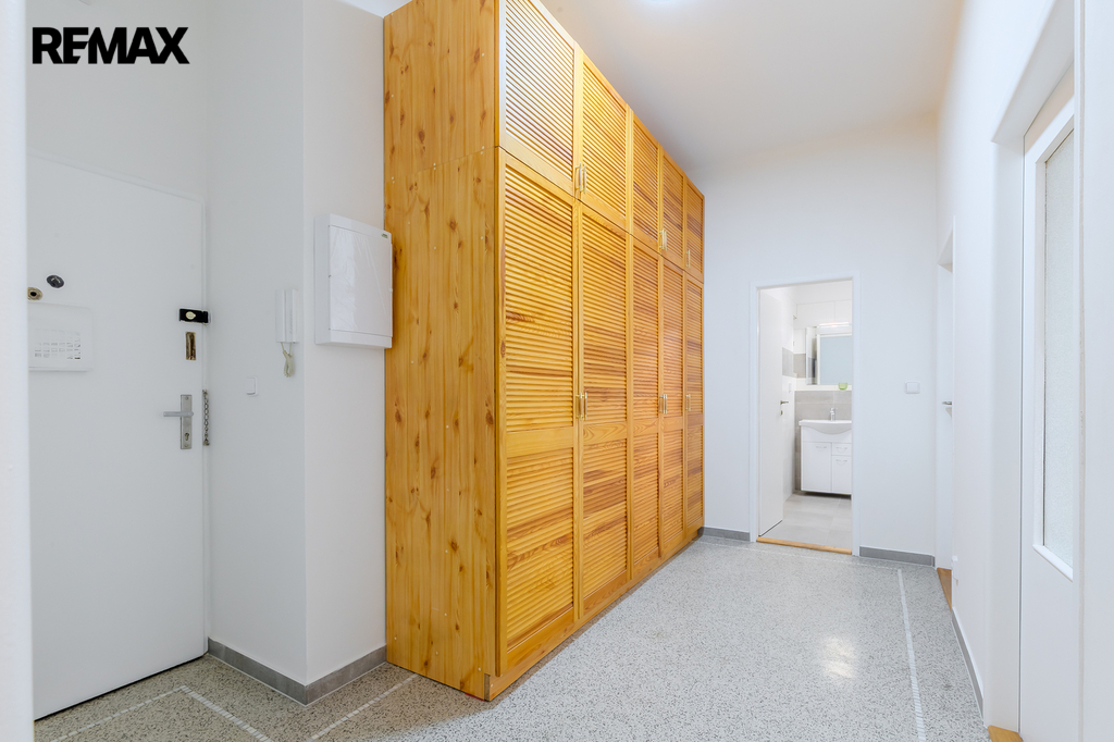 Dispozice dále nabízí samostatný, prostorný pokoj (cca 21,8 m²), který lze využít jako ložnici či hlavní obytný prostor. Z kuchyně je vstup na balkon (cca 3 m²) s příjemným výhledem do okolí. Praktickým benefitem je také komora / spíž (cca 0,8 m²), která nabízí další úložný prostor. Koupelna (cca 3,9 m²) je nově vybudovaná se sprchovým koutem, samostatná toaleta (cca 2,6 m²) je oddělená. Velkým benefitem bytu je prostorná vstupní chodba s nadstandardním úložným prostorem (cca 12,5 m²).