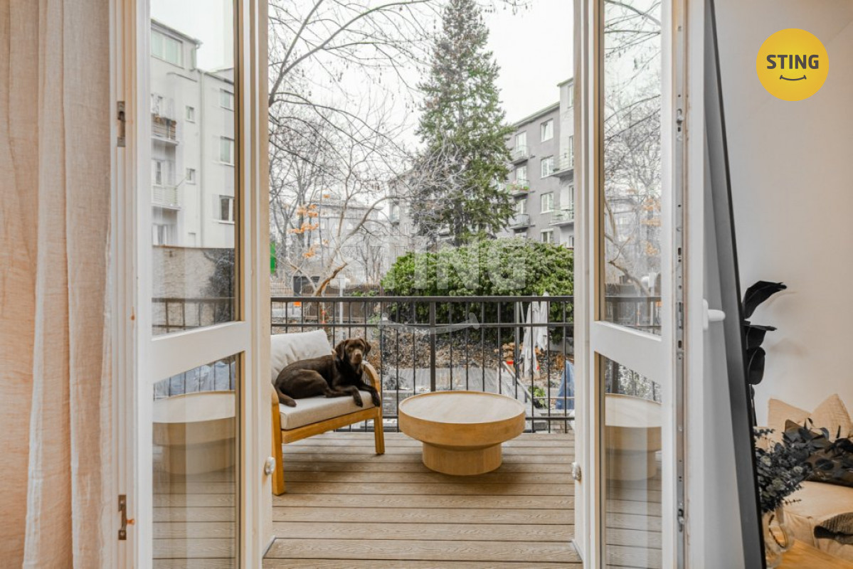 Francouzské okno se vstupem na balkon zajišťuje dostatek denního světla i soukromí tichého vnitrobloku pro ranní kávu nebo večerní posezení.