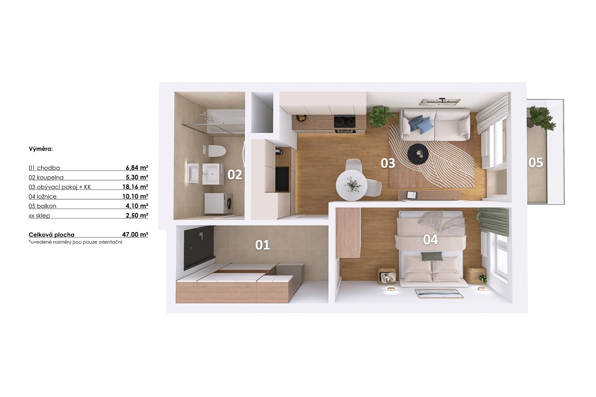 - Celková podlahová plocha: 47 m²