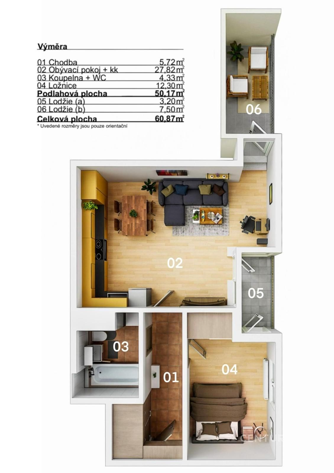 | Dispozice/podlahová plocha: | 2+kk/61 m² |