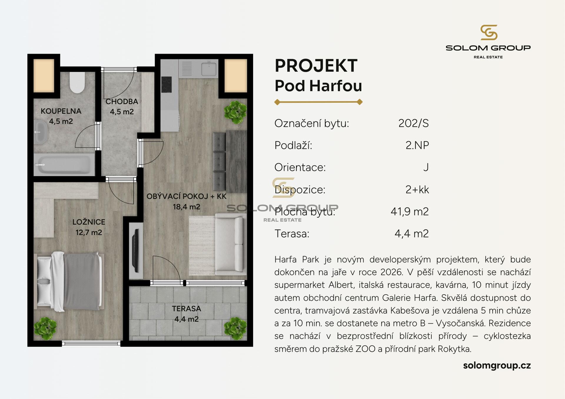 Prodej nového bytu 2+kk o velikosti 41,9 m² + terasa 4,4 m², který se nachází ve 2. NP cihlové novostavby v rezidenci Harfa Park (dům S).
