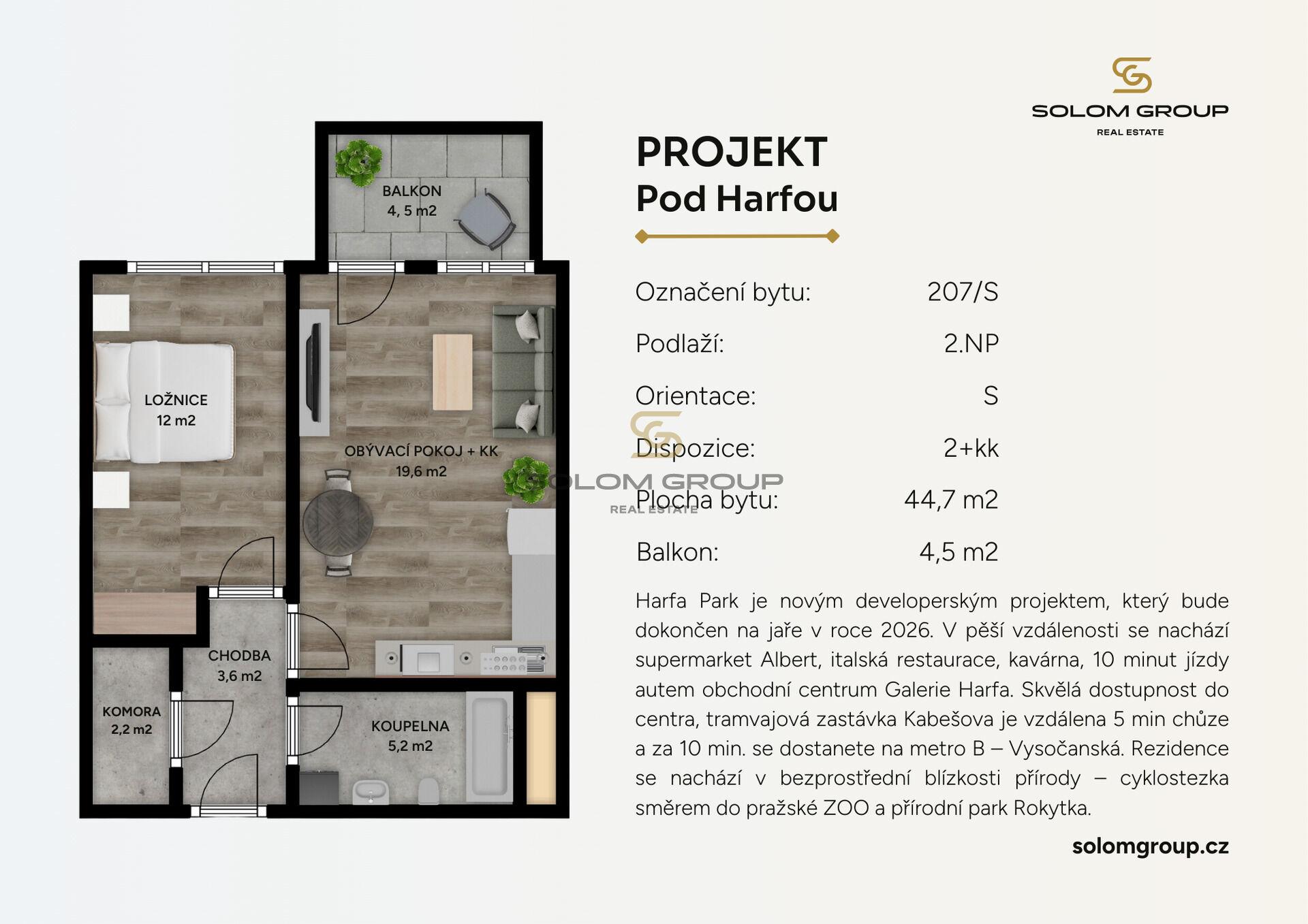 Prodej nového bytu 2+kk o velikosti 44,7 m² + terasa 4,5 m², který se nachází ve 2. NP cihlové novostavby v rezidenci Harfa Park (dům S).