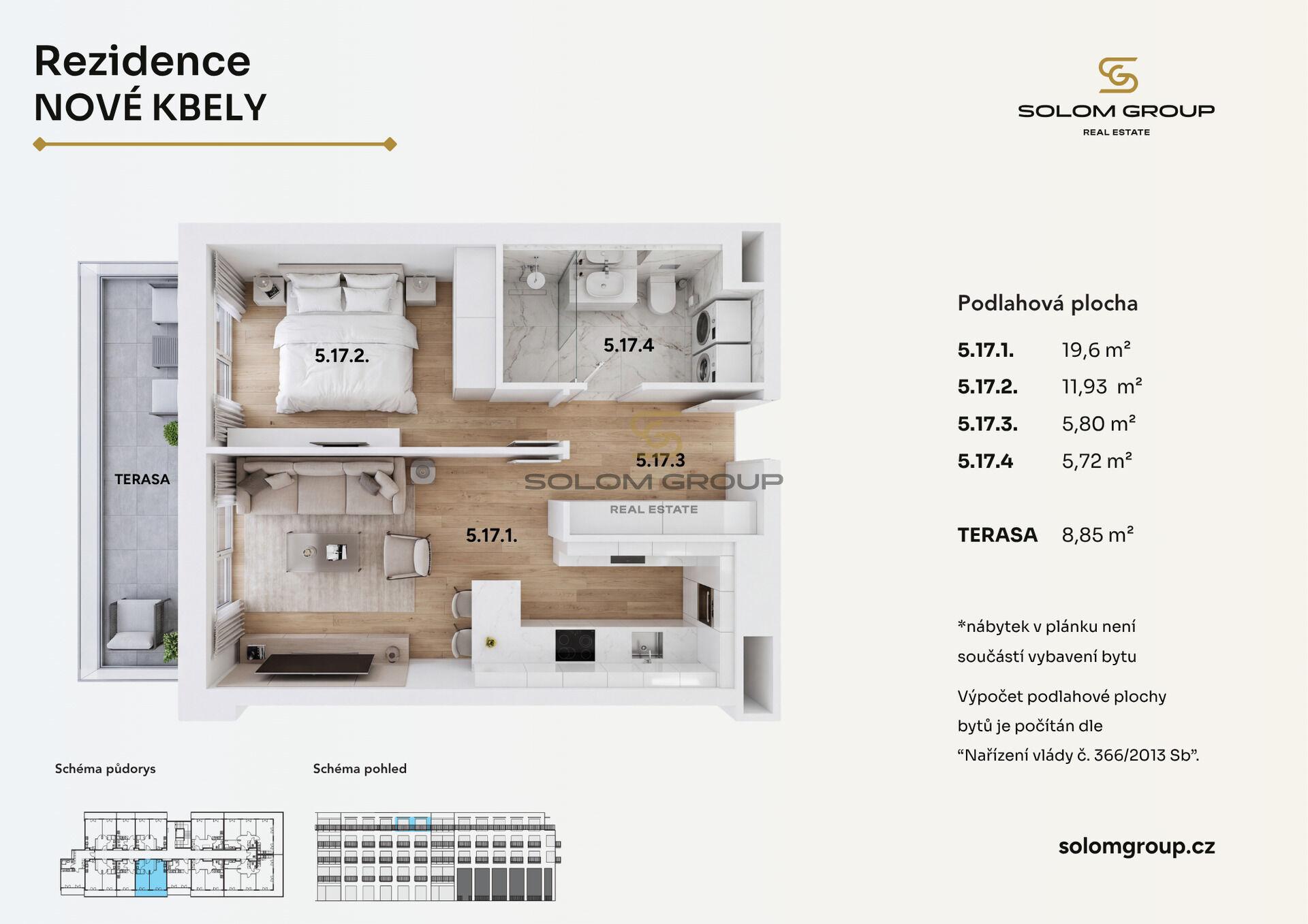Prodej nového bytu 2+kk, 44,6 m² + terasa 8,85 m², který se nachází v 5. NP cihlové novostavby v rezidenci Nové Kbely, Praha – Kbely.