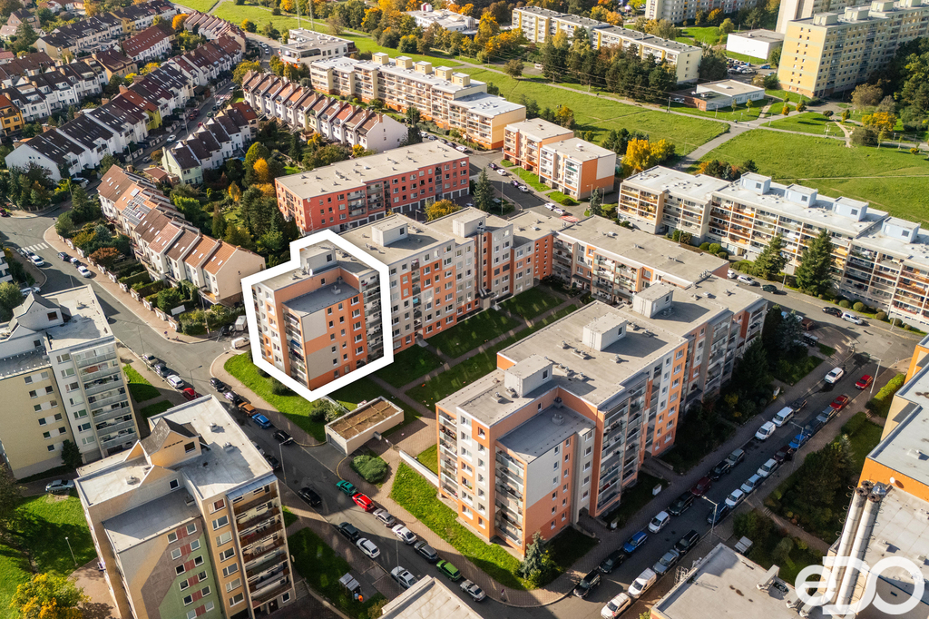 Dispozice je praktická a funkční – obývací pokoj s kuchyňským koutem a vstupem na lodžii, ložnice orientovaná do vnitrobloku a koupelna s vanou a toaletou.