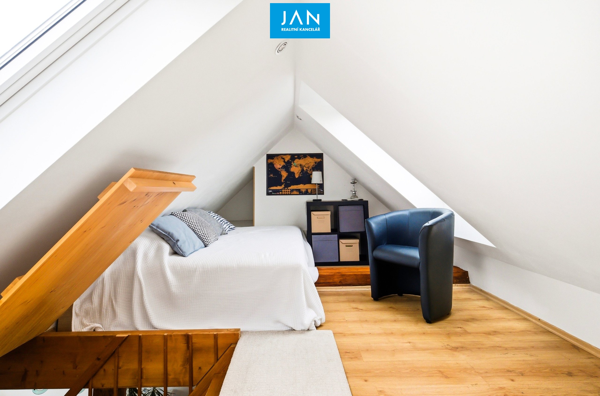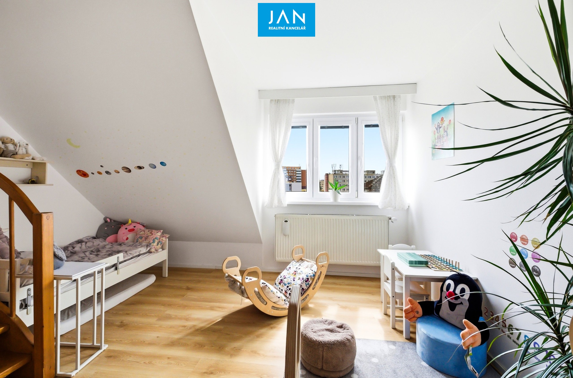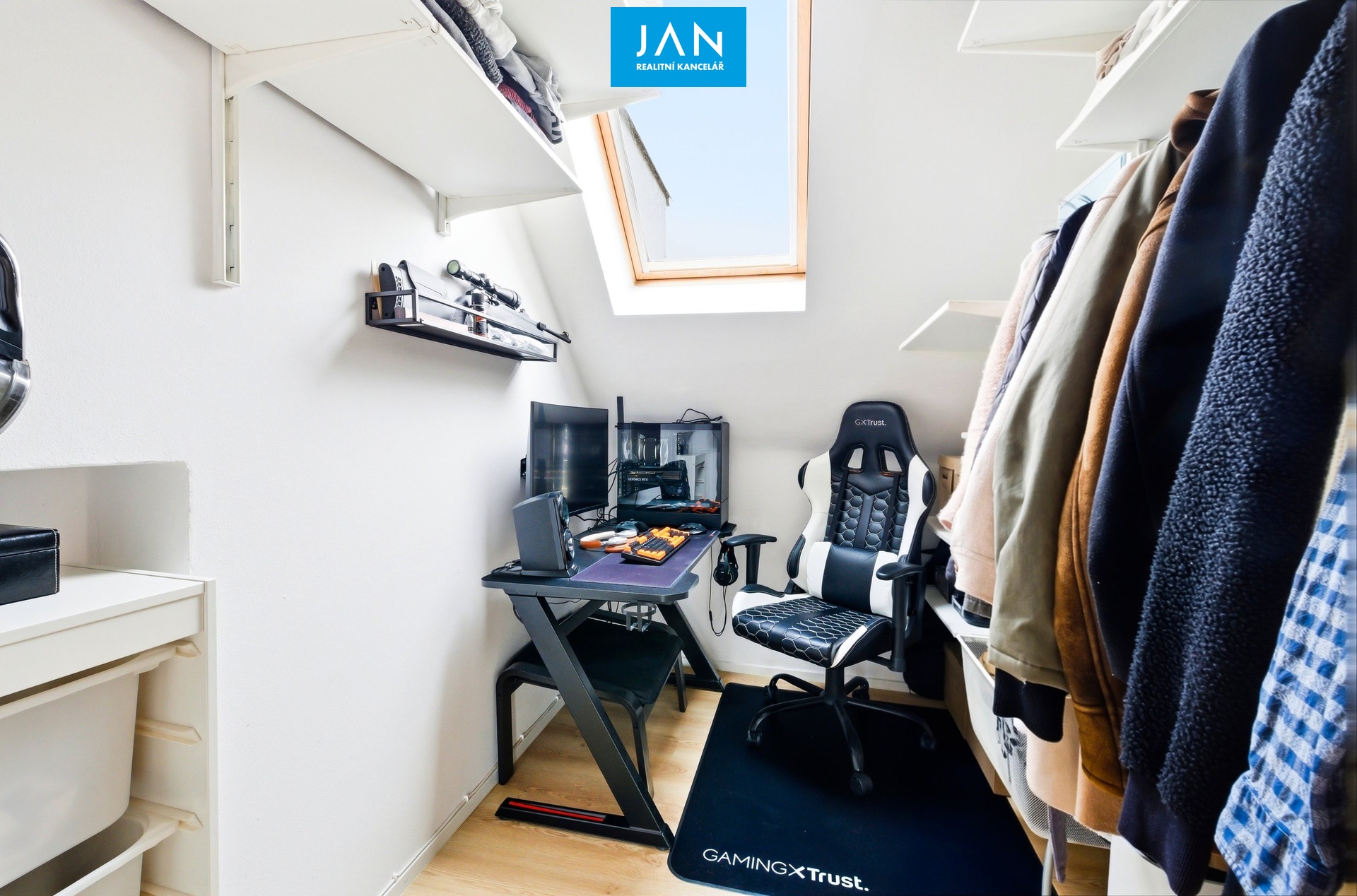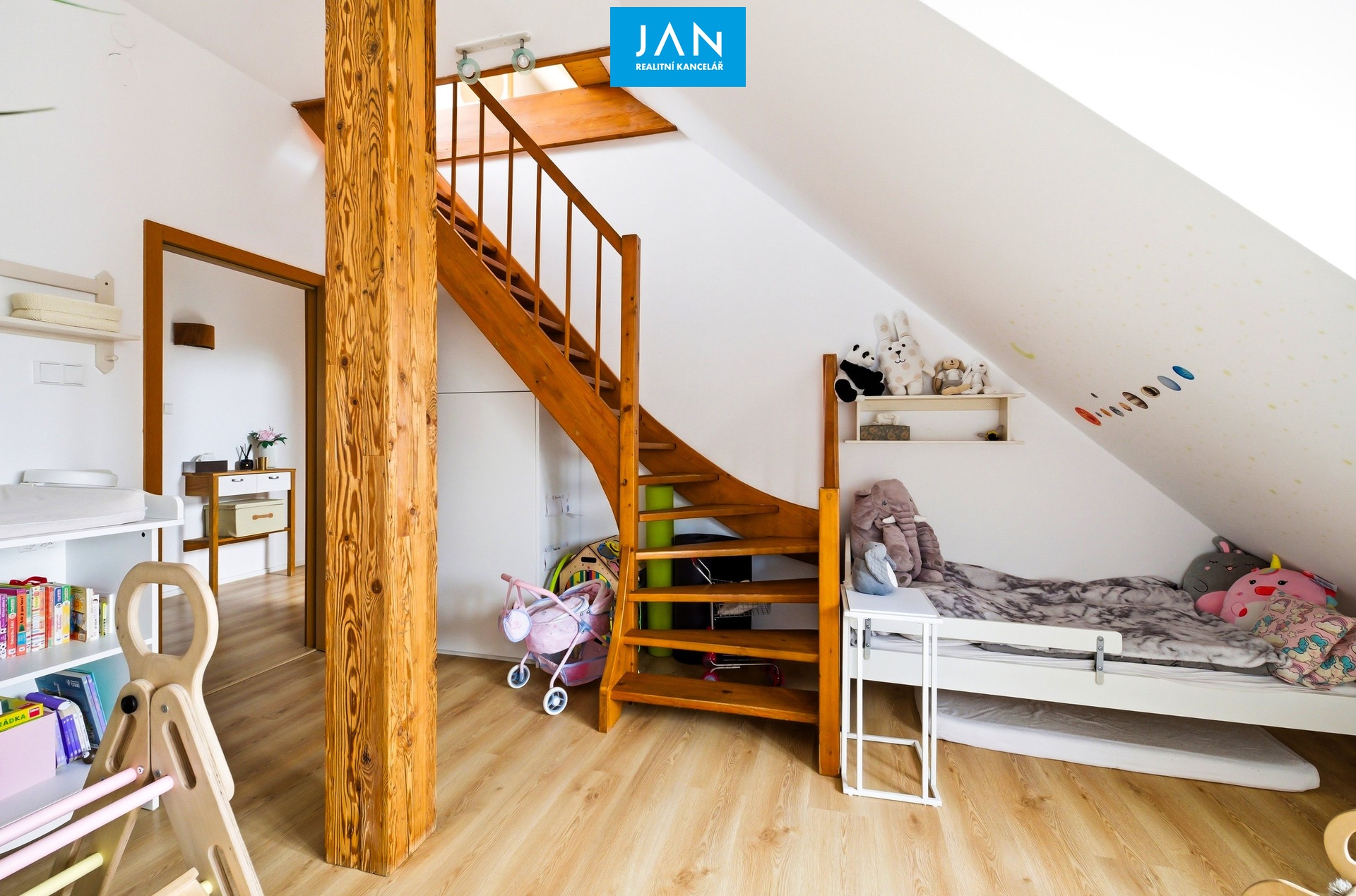 Na rámec dané výměry pak dalších 24 m² představuje podkrovní prostor s nižší světlou výškou, který je dnes využíván jako kombinace pracovny a spaní pro návštěvy a je přístupný z dětského pokoje.