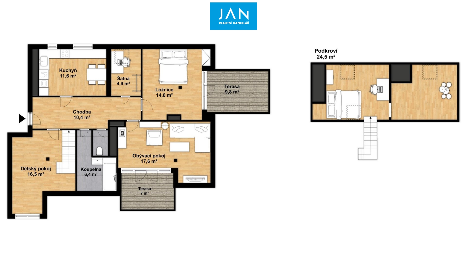 Nabízí celkovou podlahovou plochu 104 m², z čehož:
