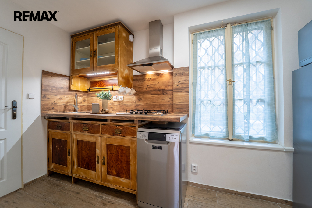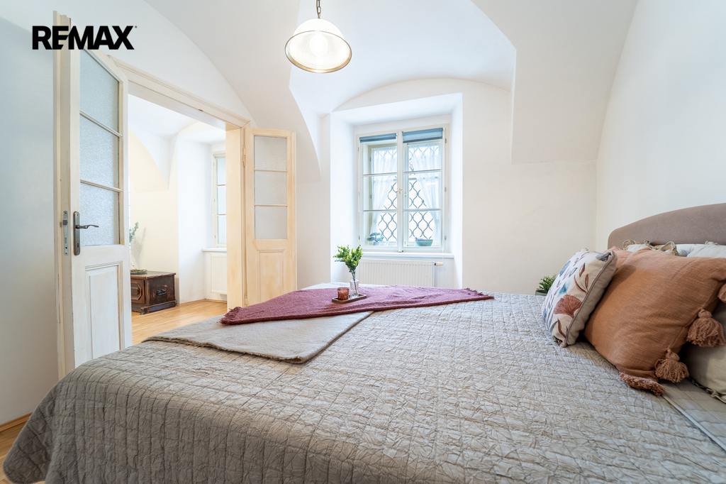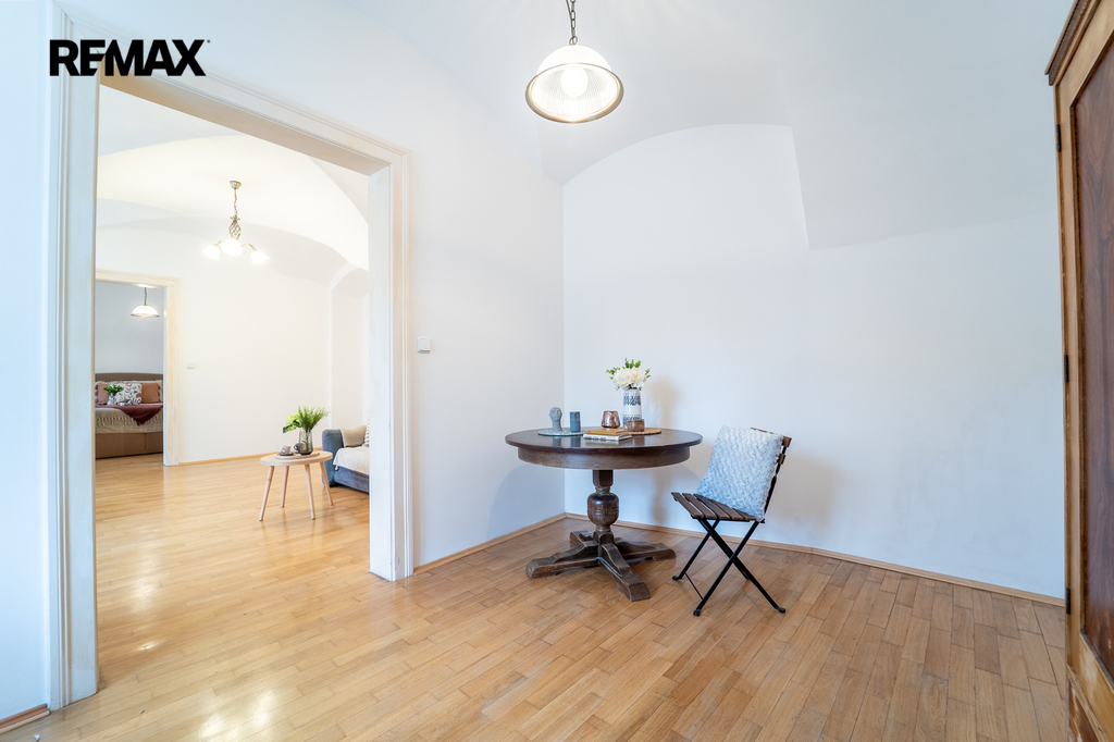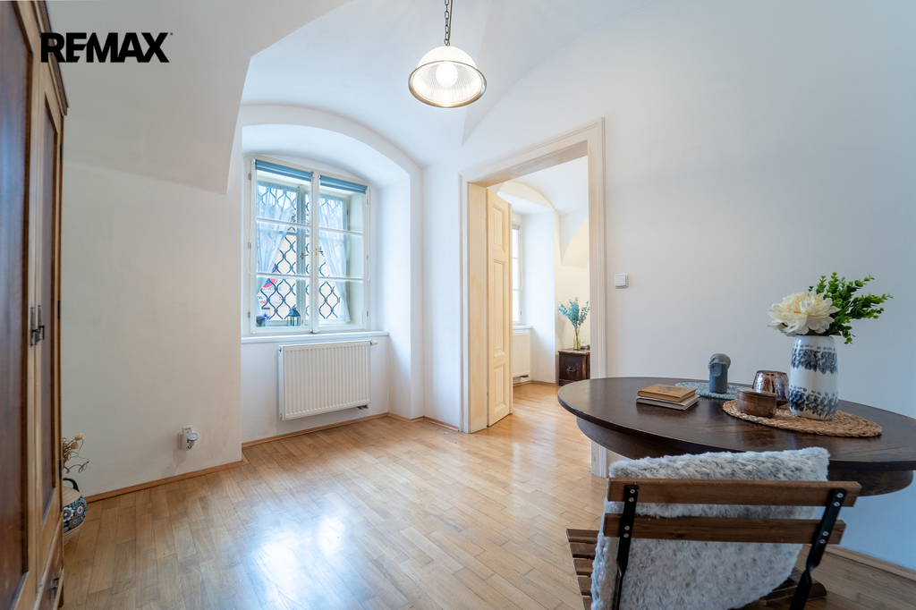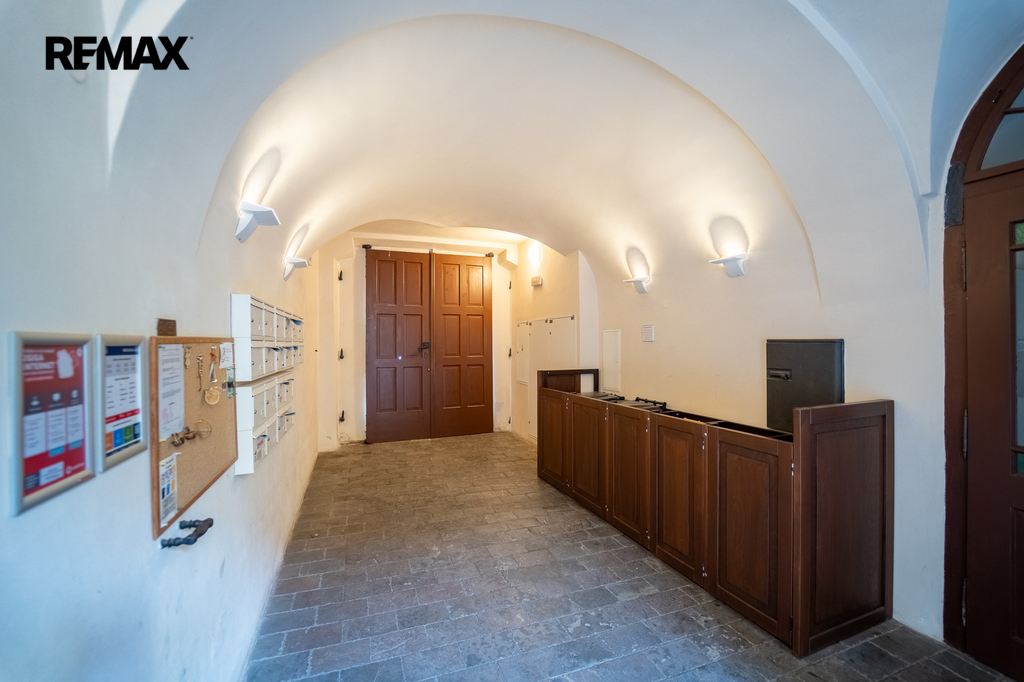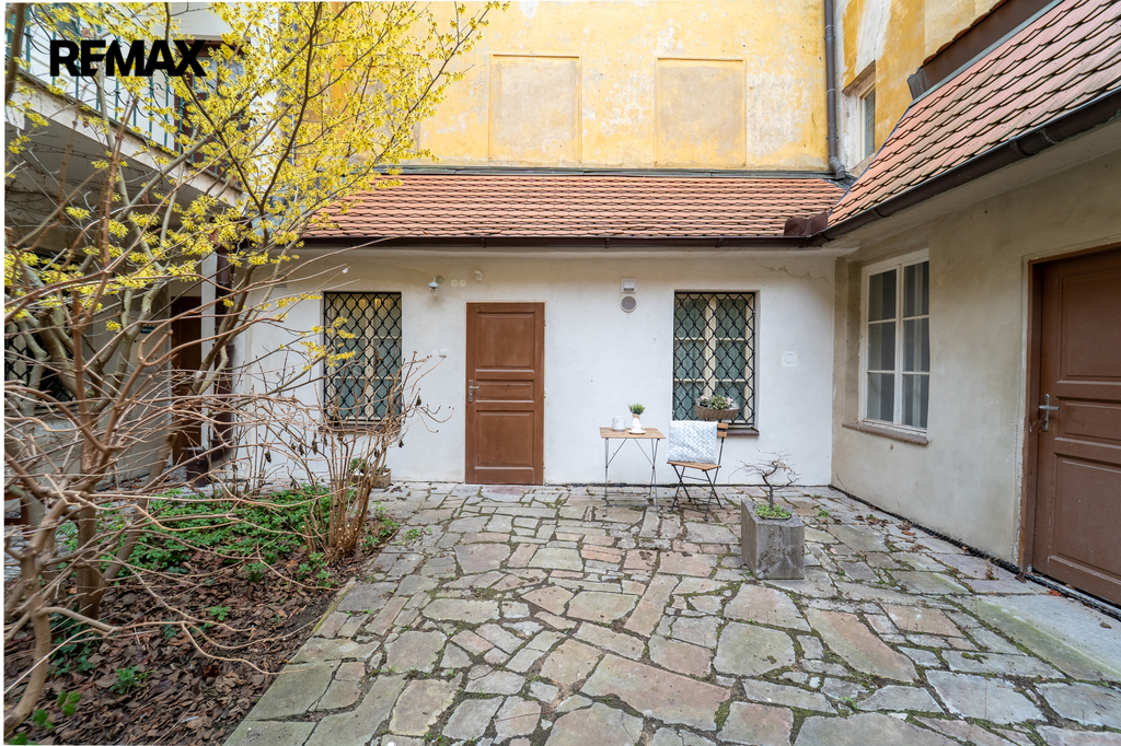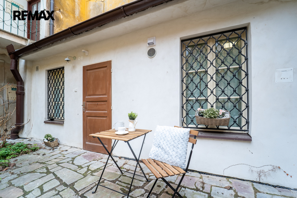 Velkou předností bytu je také přímý vstup do klidného vnitrobloku domu, kde je možné využívat příjemné posezení, ideální pro relaxaci či trávení času v soukromí mimo ruch historického centra.