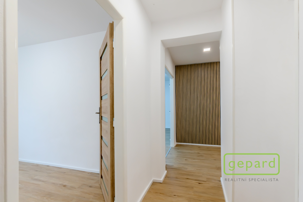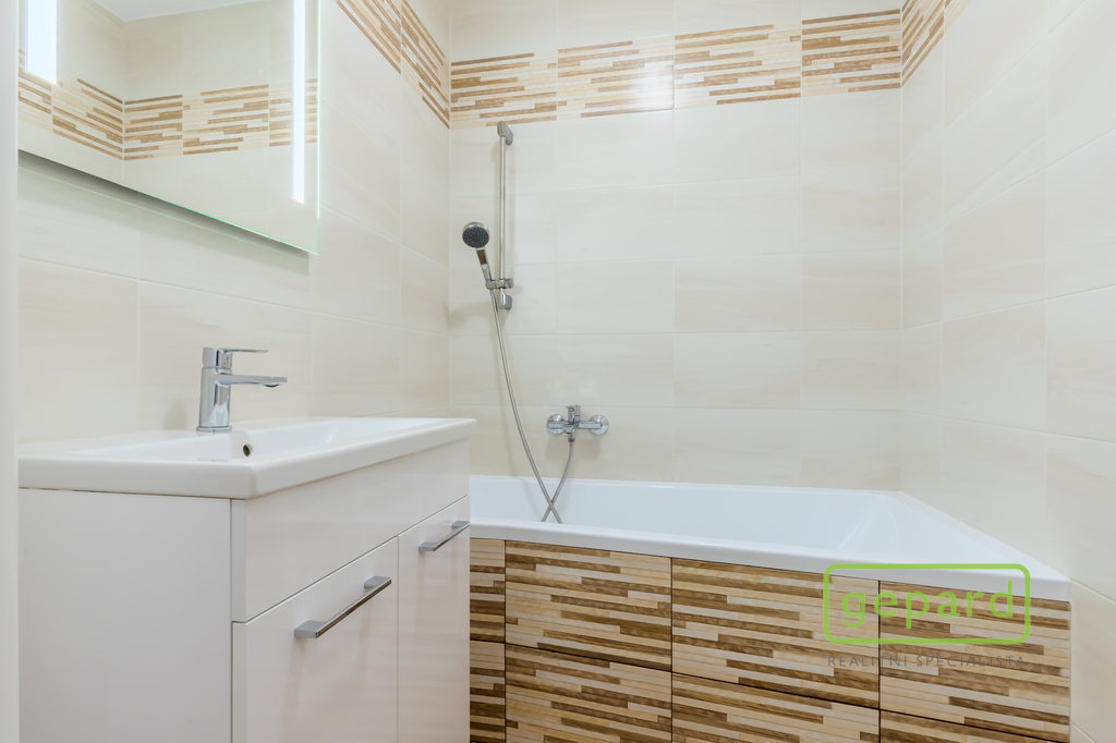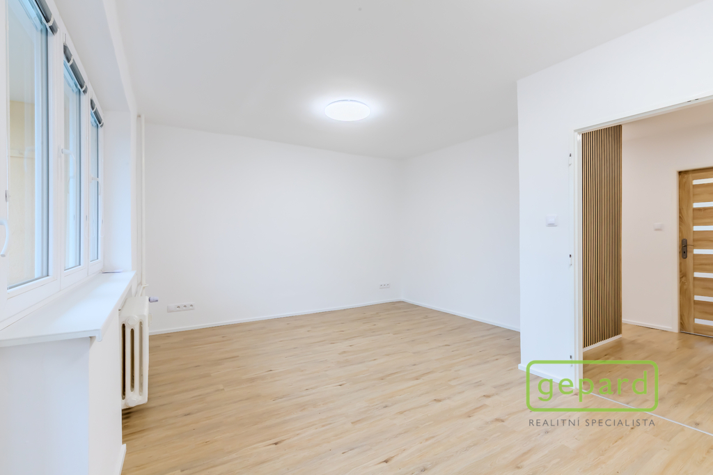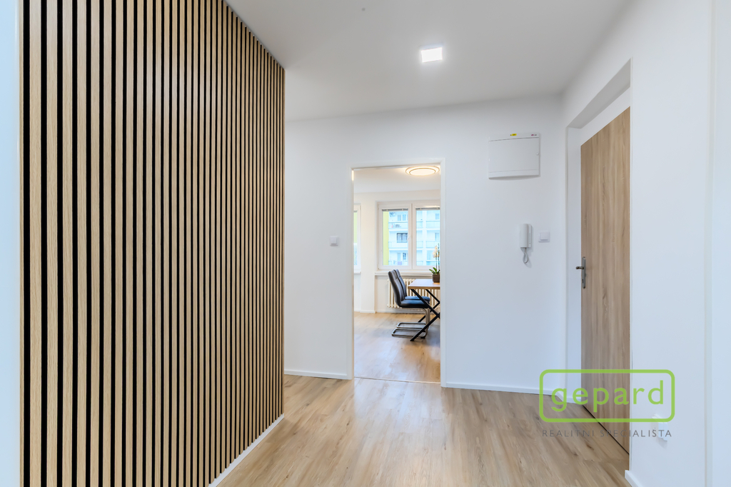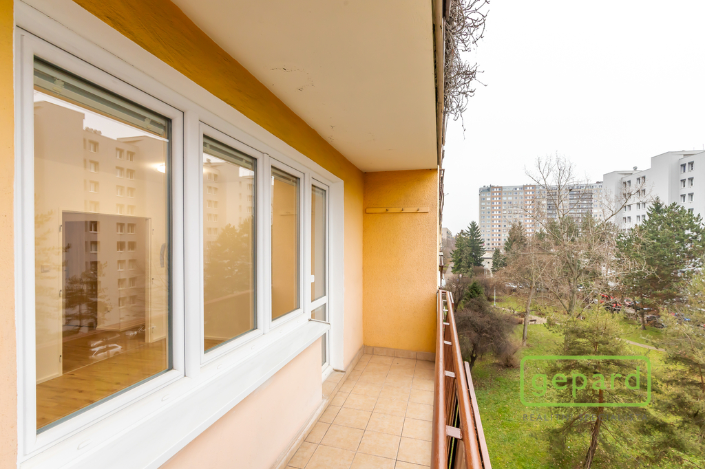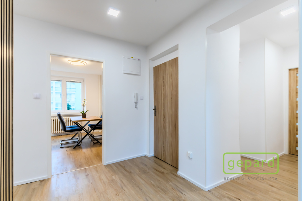 Interiér tvoří světlý obývací pokoj, samostatná kuchyně, dva neprůchozí pokoje, koupelna s vanou a samostatná toaleta. Příjemným benefitem je lodžie o velikosti 6 m², ideální pro ranní kávu či večerní odpočinek, a také sklepní kóje o velikosti 3 m², která poskytuje praktický úložný prostor.