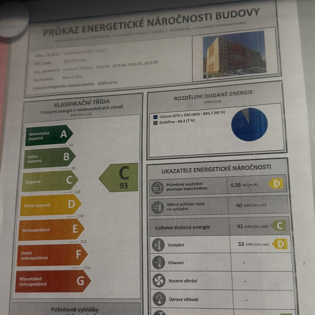 - Ukazatel energetické náročnosti budovy: 91 kWh/m²