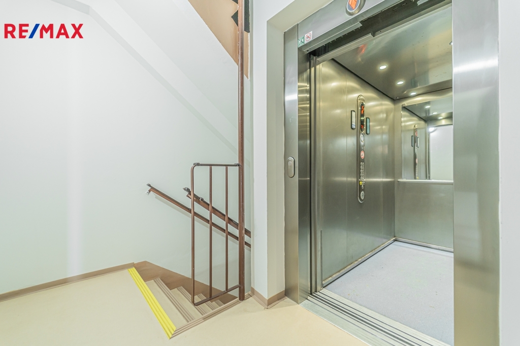 Byt se nachází v 5. patře s výtahem. K bytu náleží sklep a dále je v domě k dispozici kočárkárna a kolárna.