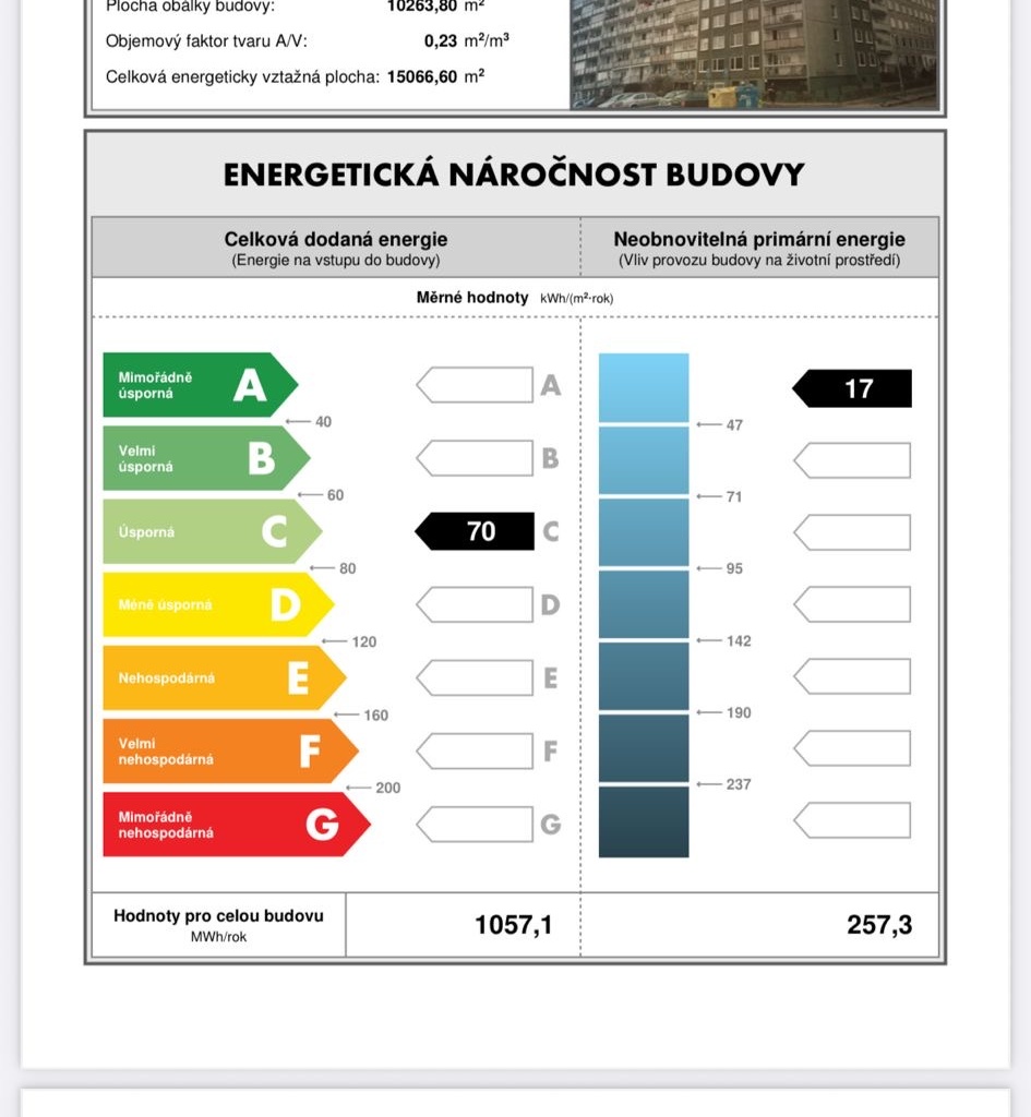 - Ukazatel energetické náročnosti budovy: 1057.1 kWh/m²