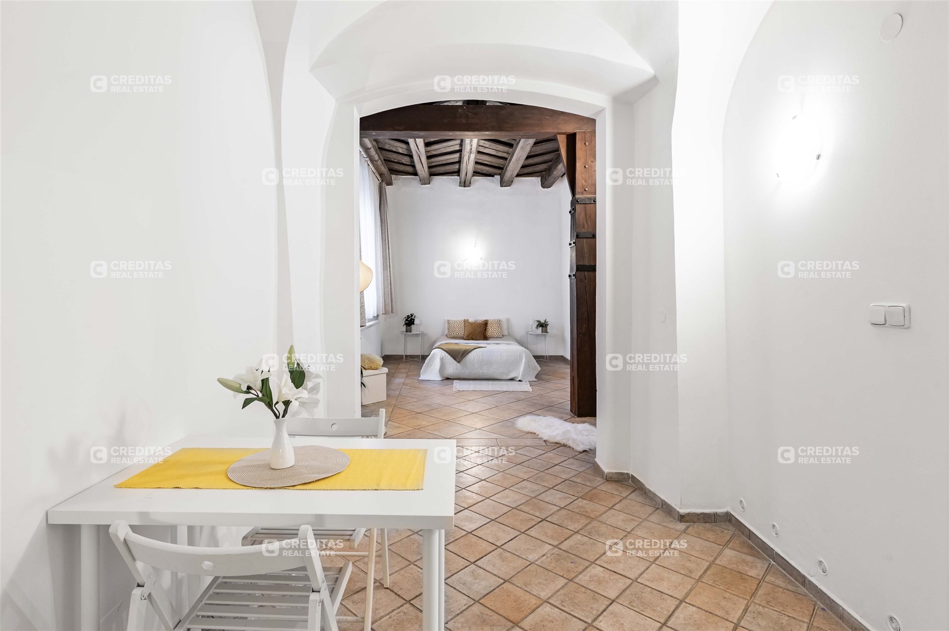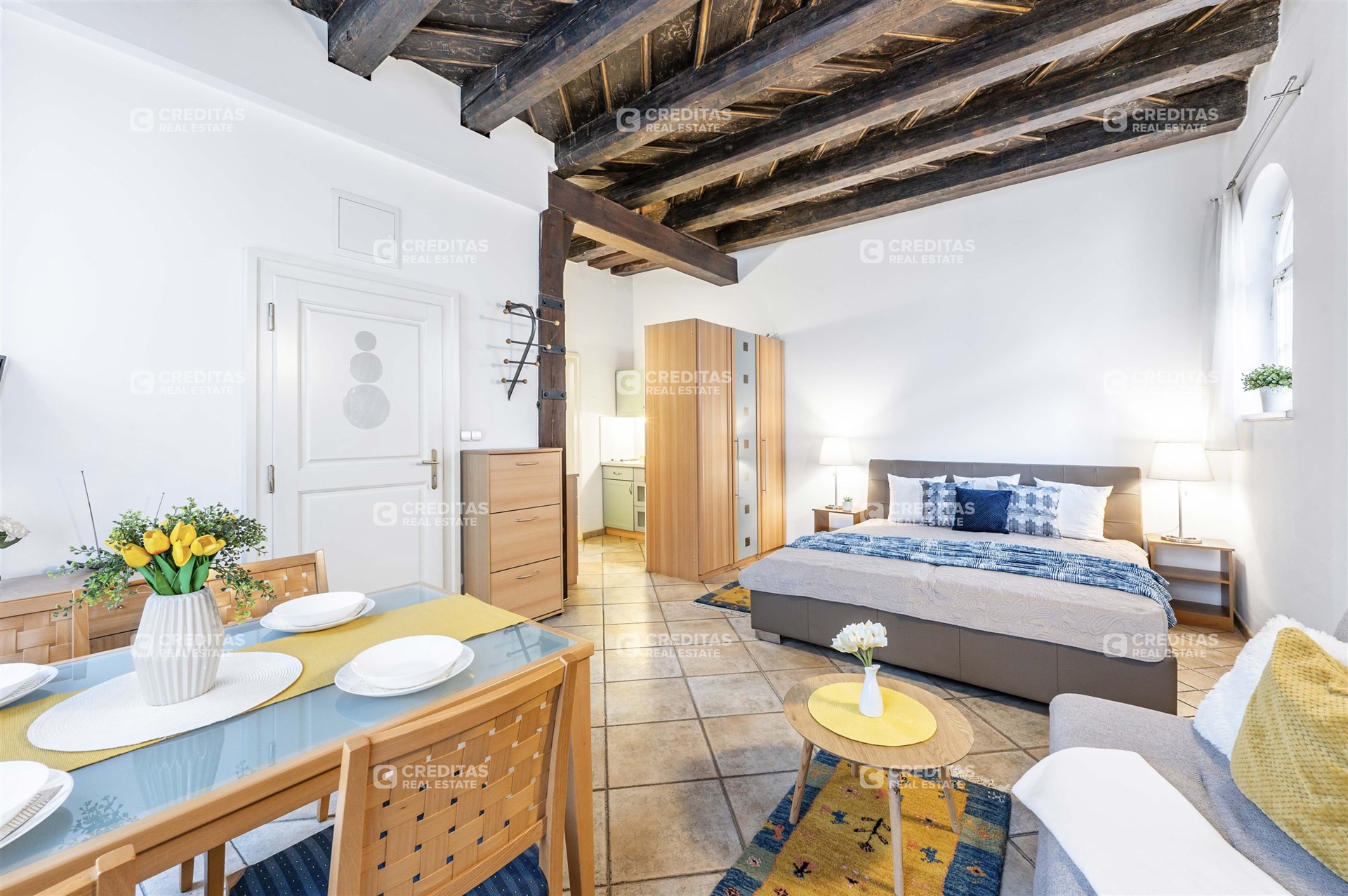 Atmosféru bytu podtrhují původní trámové konstrukce a zachovaný historický charakter domu, který dodává nemovitosti jedinečný genius loci.