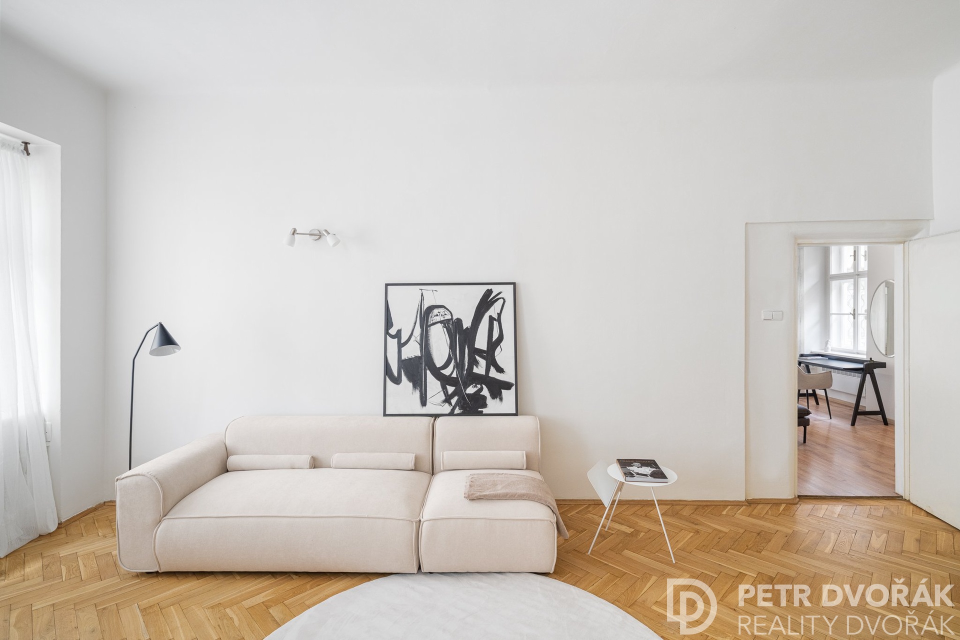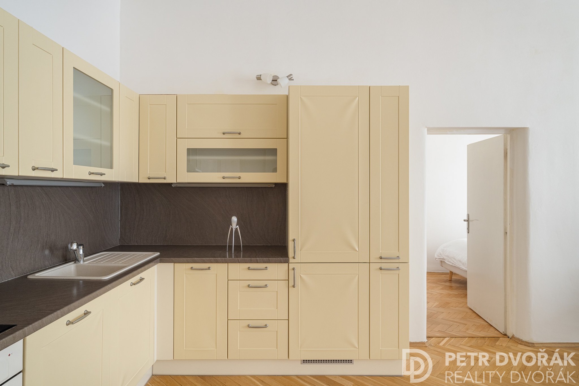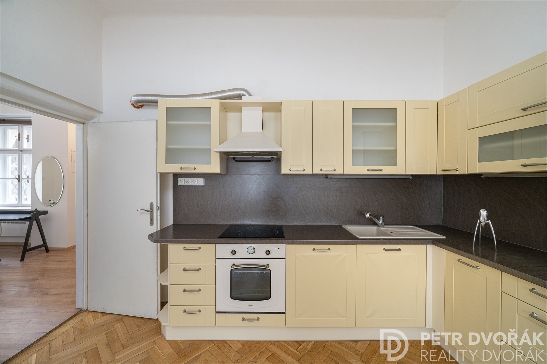 Pak obývací pokoj s kuchyňským koutem. Dvě kastlová okna s hlubokými špaletami otevřená do Haštalské ulice – ráno tudy nikdo nespěchá, turisté ji nenajdou, zní tu kroky. Kuchyň je vyrobena na míru: lednice s mrazákem, myčka, trouba, varná deska. Na podlaze původní parkety, nově renovované v roce 2024.