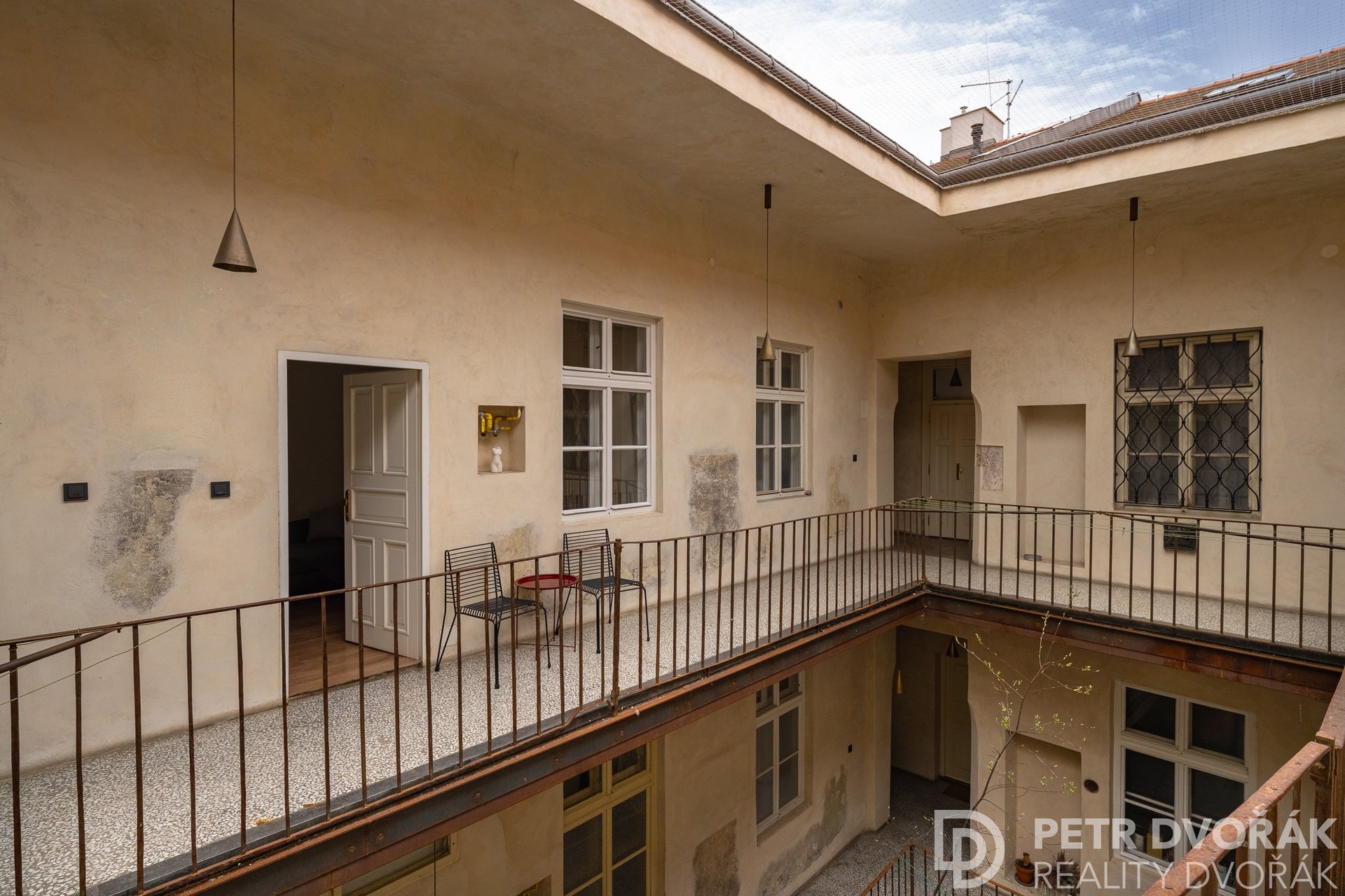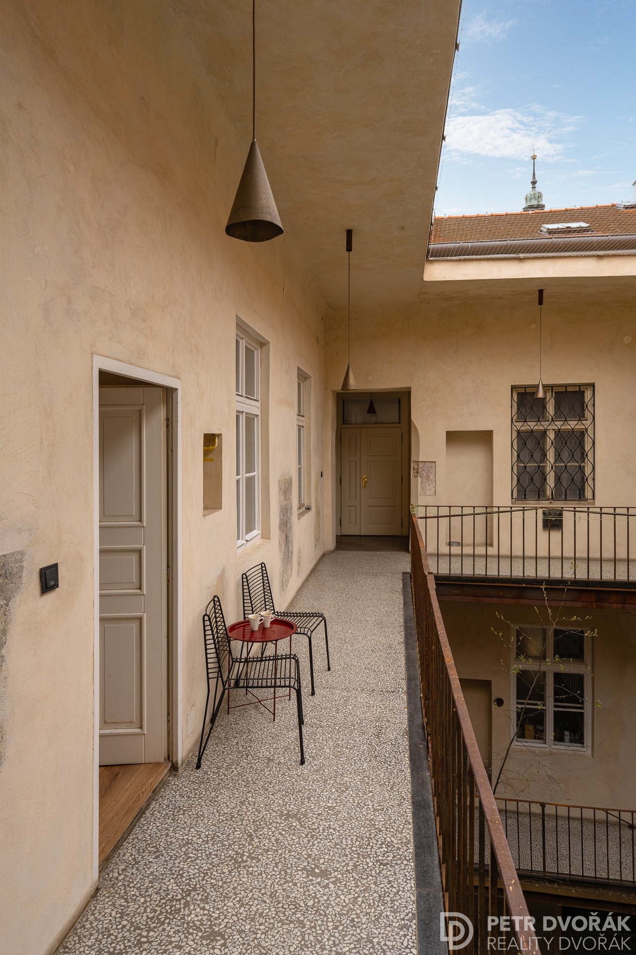 Než vkročíte do bytu, zastavíte se tady. Stolek, dvě křesílka, výhled do dvora. Ranní káva nebo večerní víno – venku, a přitom soukromě. Nikdo sem nevidí.