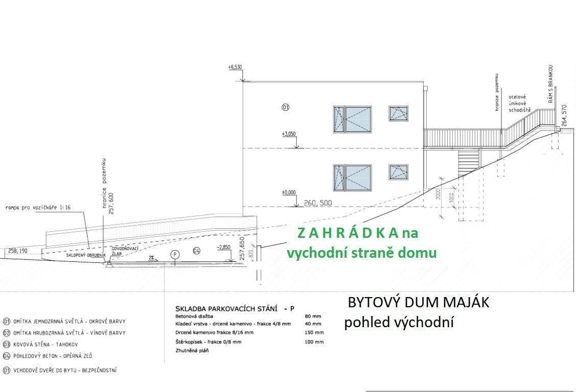 Bytový dům Maják obsahuje pouze 4byty, na úrovni ulice se nachází pro každý byt 2parkovací stání a úložná komora(sklep) cca 5,5m2. Bezbariérově po rampě se od parkoviště dostaneme do 2bytů v 1.patře domu, každý byt má vlastní vstup zvenku. 2 byty ve druhém patře mají také své vstupy z podesty přístupné po schodišti.