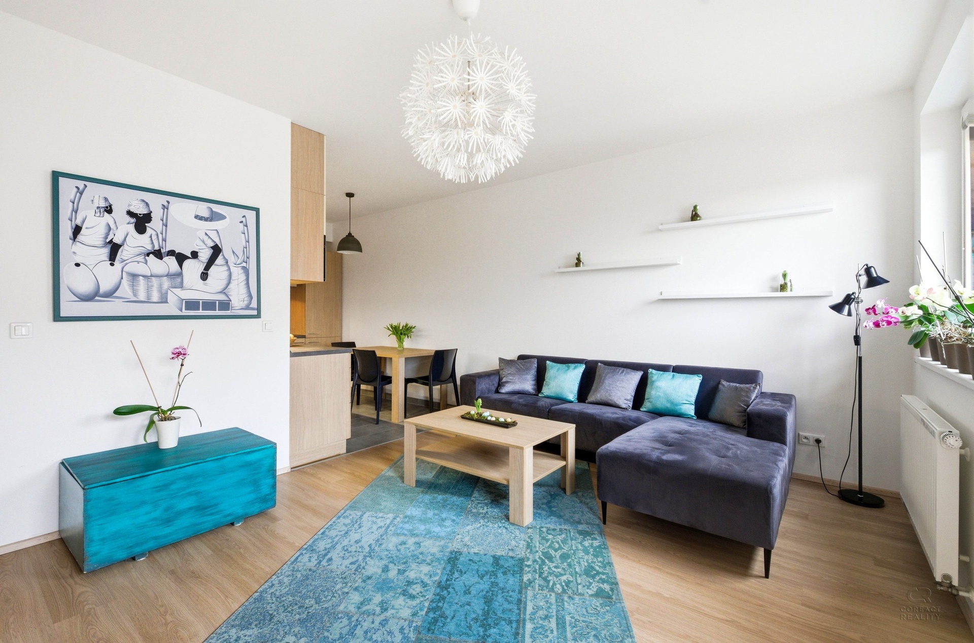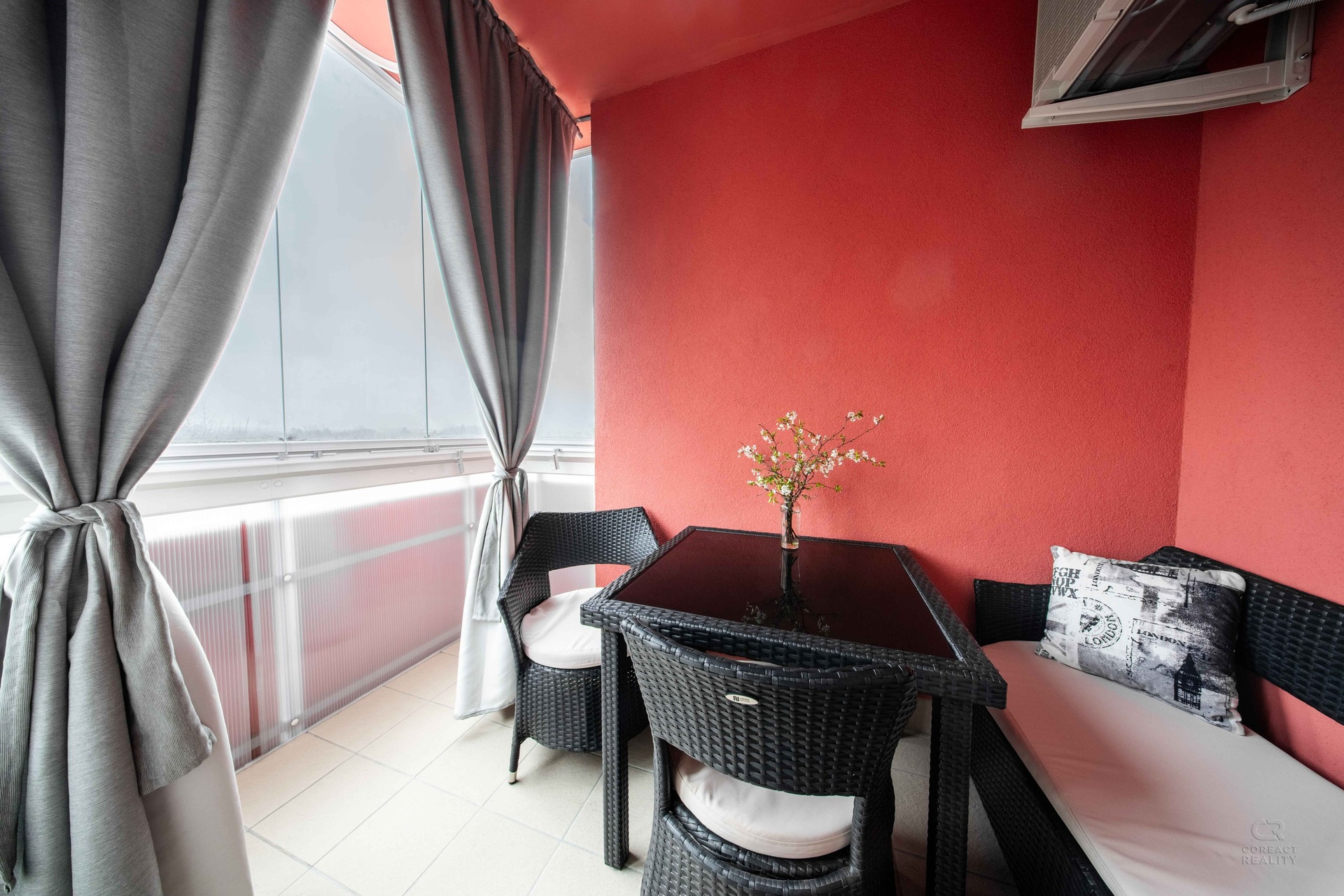 kuchyňským koutem, dvě samostatné ložnice, koupelnu a oddělené WC. Navíc každá místnost je klimatizovaná a okna bytu jsou opatřena před okenními stahovacími roletami. K bytu náleží lodžie a balkon o výměře 11.8m2, dále vnitřní parkovací místo a sklep (3.2m2)