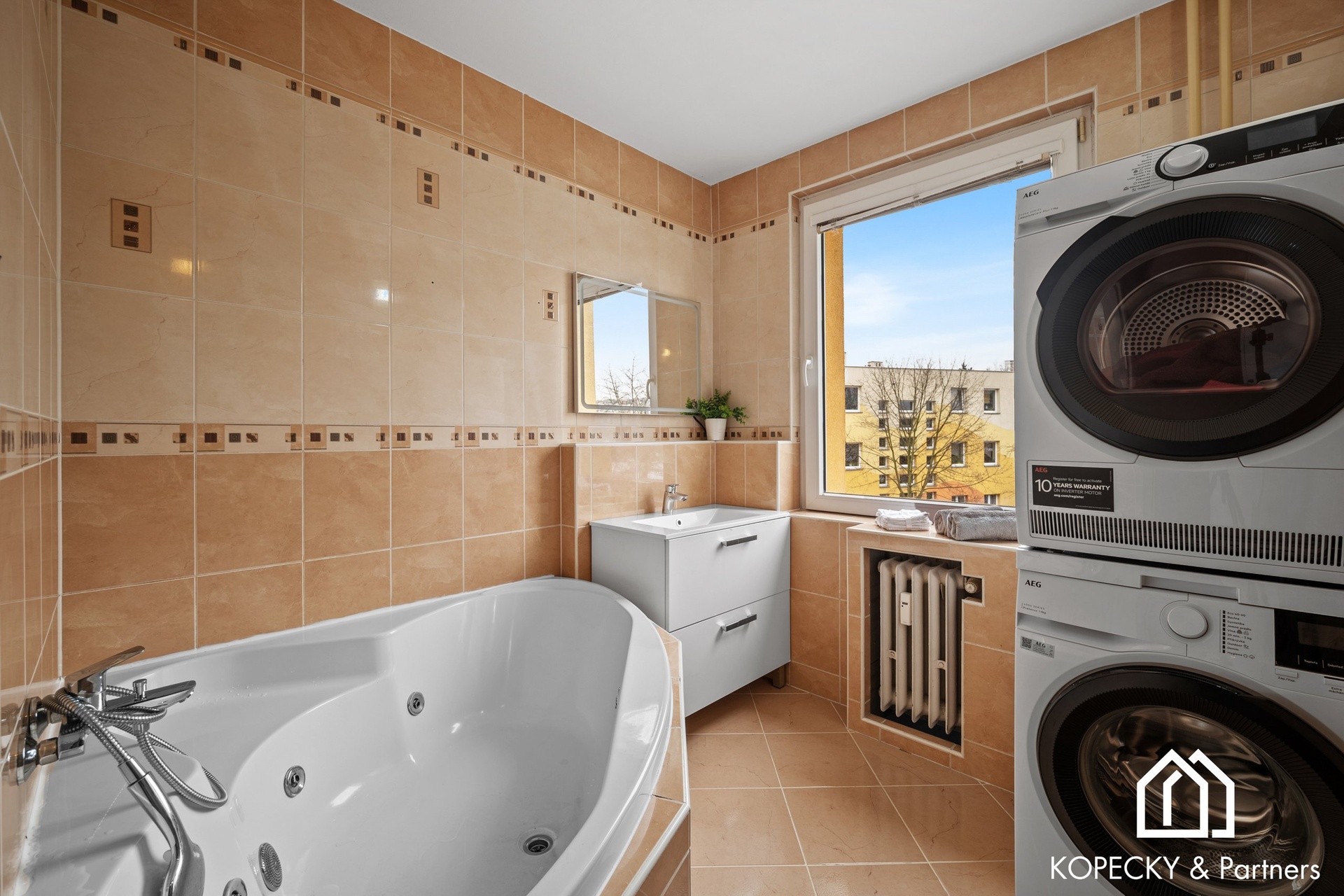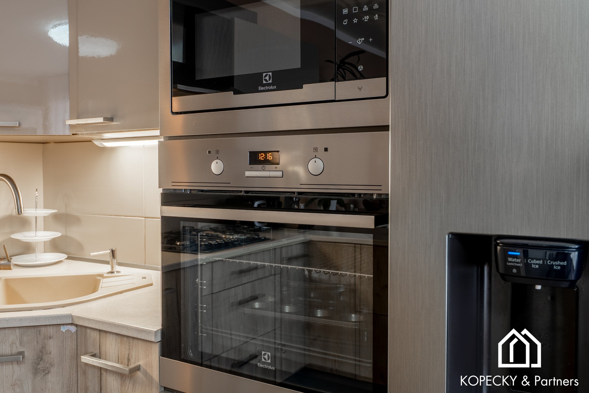 Součástí prodeje je kuchyňská linka včetně spotřebičů: myčka, plynový sporák, elektrická trouba a americká lednice. Byt je připraven tak, aby nový majitel mohl fungovat prakticky okamžitě bez řešení základního vybavení. Podlahy jsou řešeny kombinací dlažby a laminátových podlah, což je ideální jak z hlediska údržby, tak z hlediska pohodlí v obytných místnostech.
