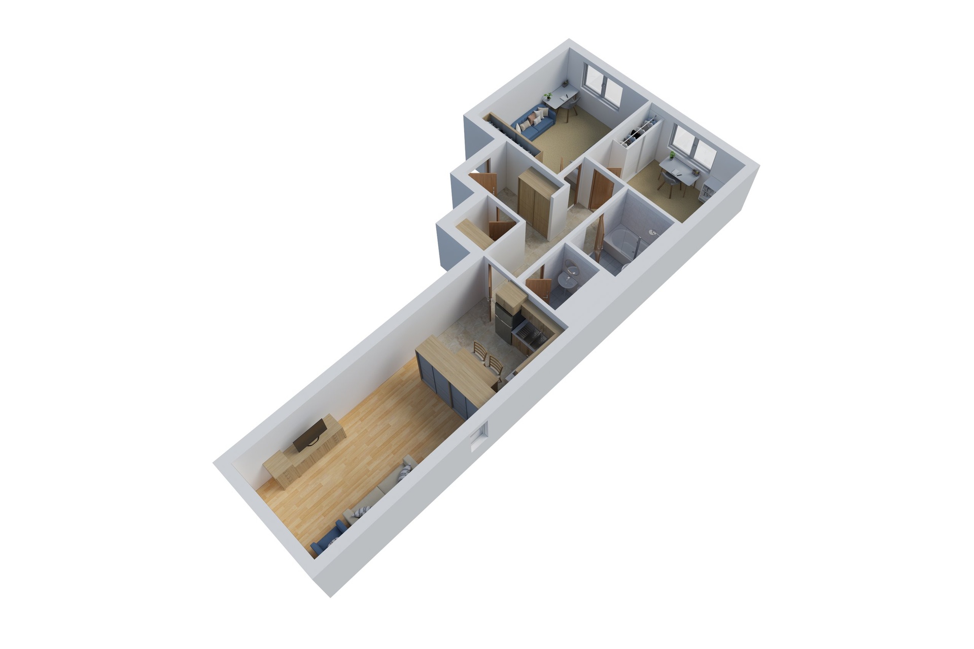 Třípokojový byt s kuchyňským koutem a komorou se nachází v moderním bytovém domě s výtahem. Dům byl kolaudován v roce 2004. Byt má prostornou vstupní chodbu s přístupem do všech částí: dva samostatné neprůchozí pokoje, obývací pokoj s kuchyňským koutem, komora, koupelna vybavená vanou, umyvadlem, vyhřívacími žebřinami, přípojkou aut. pračky a přípravou na bidet. WC je samostatné s vlastním umyvadlem. Celková plocha bytu je 72,65m2.
