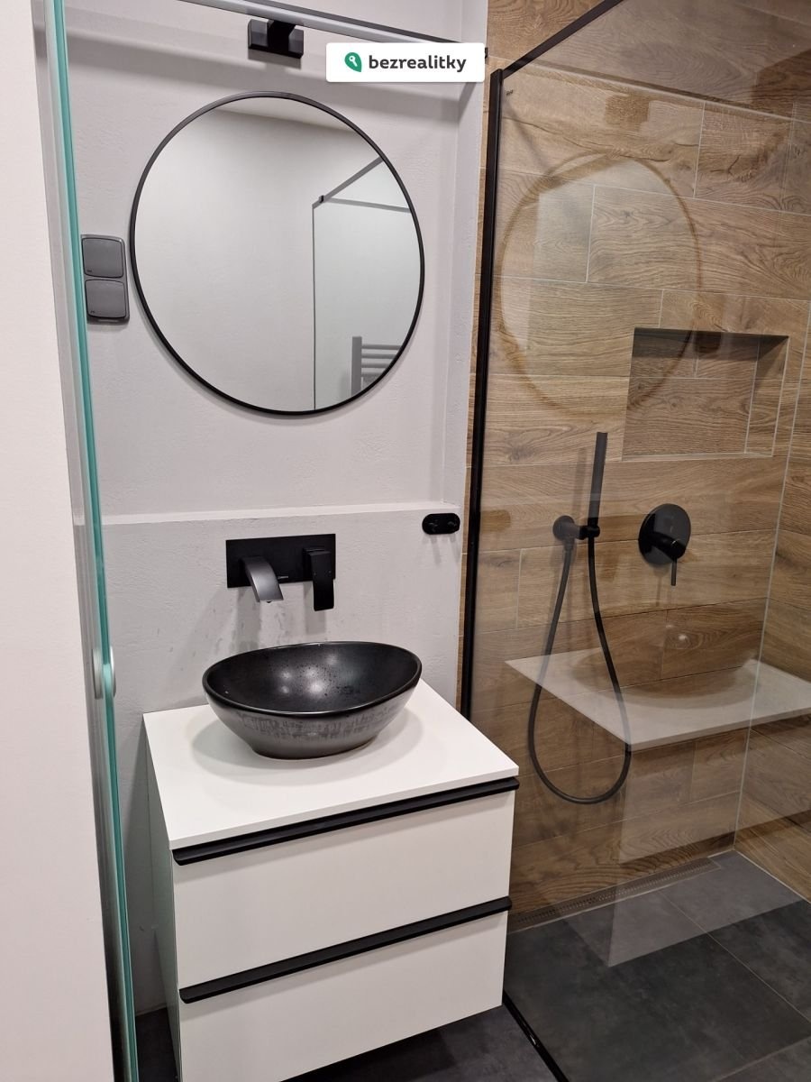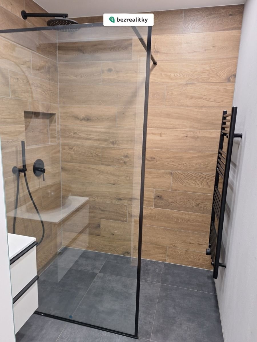 • Moderní koupelna s walk-in sprchovým koutem, velkoformátovými dlaždicemi a dlaždicemi imitujícími dřevo