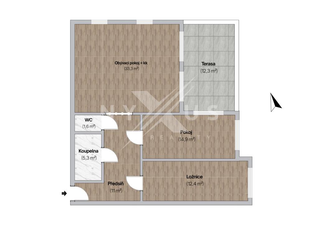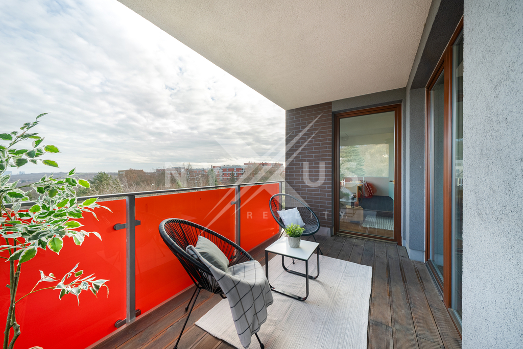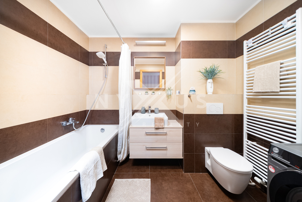 Už při vstupu je cítit důraz na prostor a světlo. Obývací pokoj s kuchyňským koutem tvoří přirozené centrum bytu a díky velkým oknům a přímému vstupu na terasu působí velmi vzdušně a otevřeně. Východní orientace přináší příjemné ranní světlo i klidný výhled na Prahu. Dispozice nabízí dva samostatné pokoje, koupelnu s vanou a oddělenou toaletu. Celý byt je řešen prakticky a zároveň působí čistě a moderně.