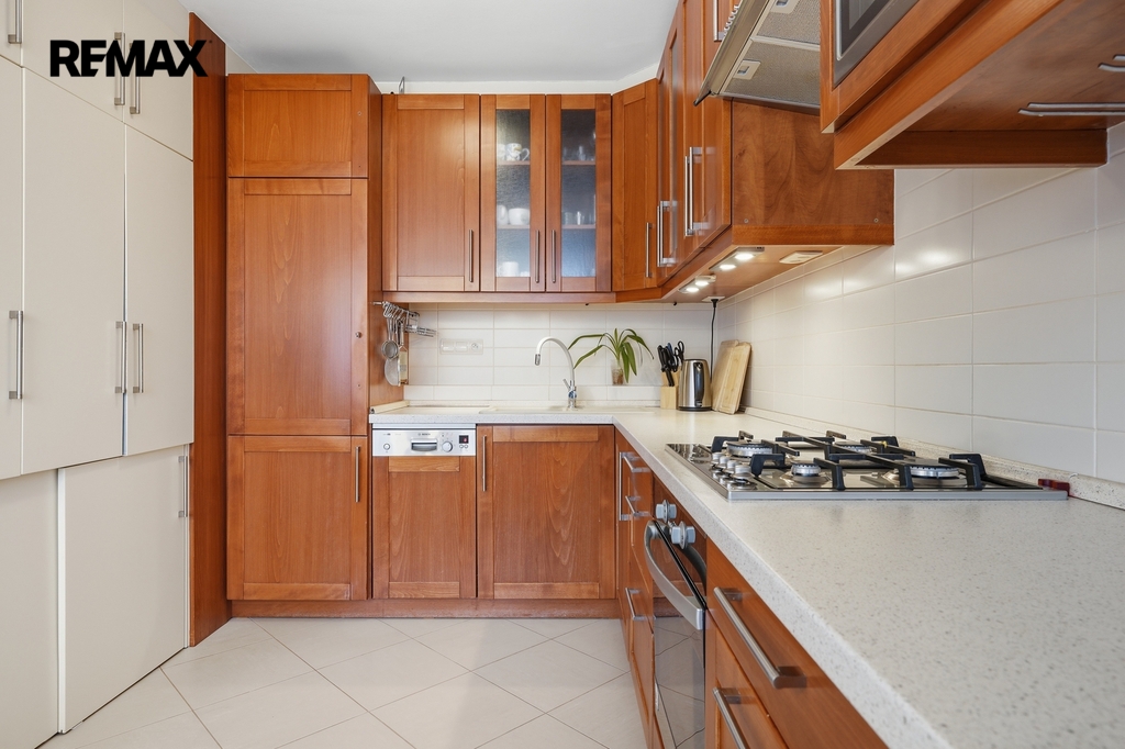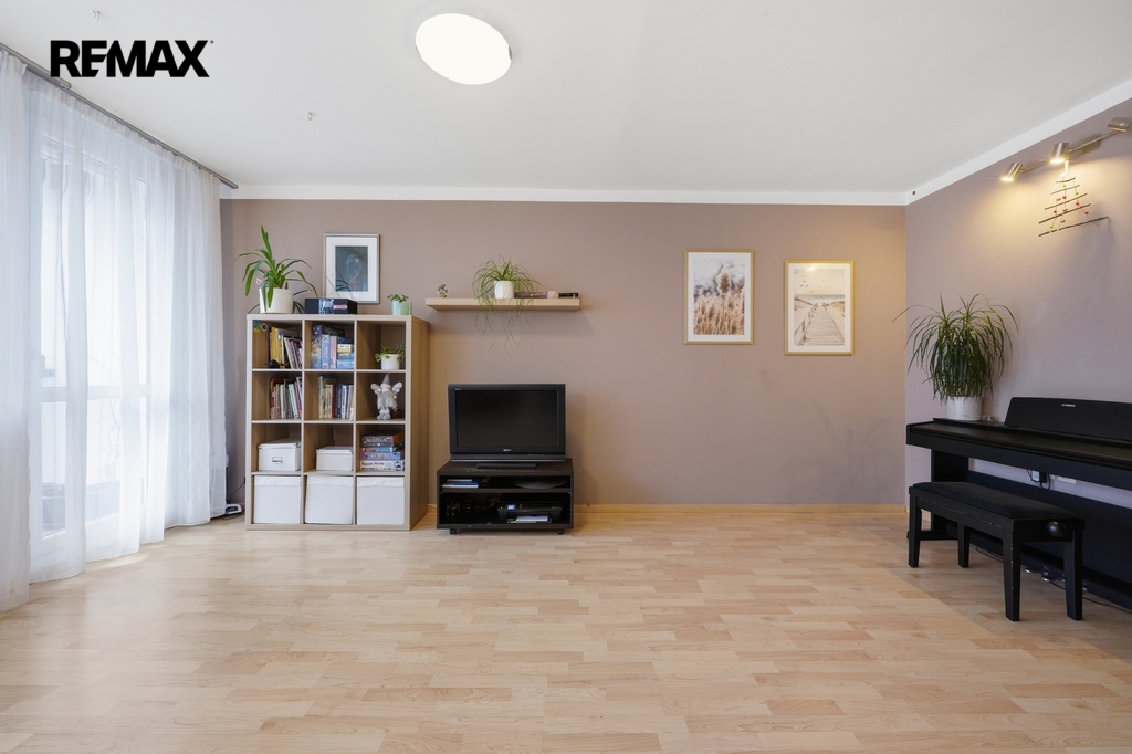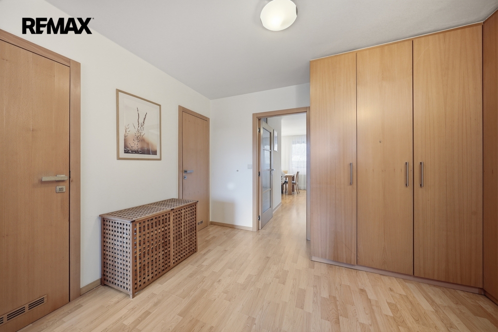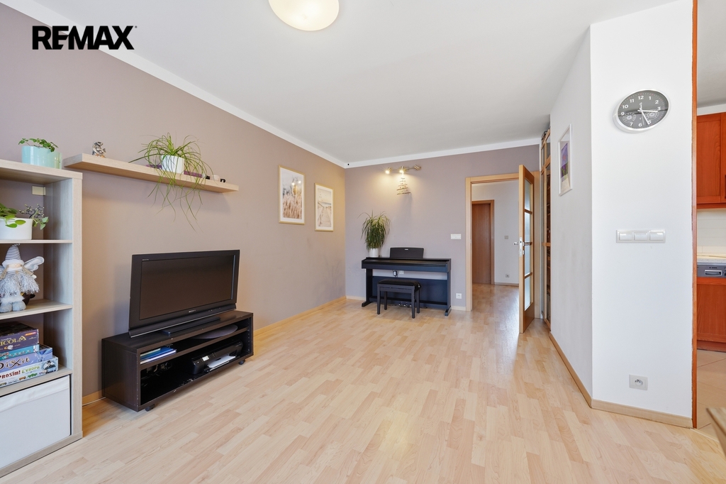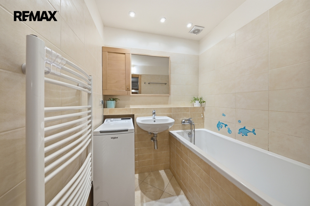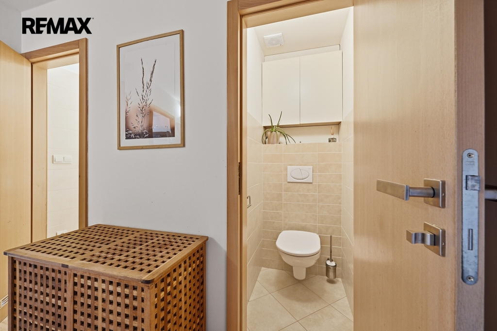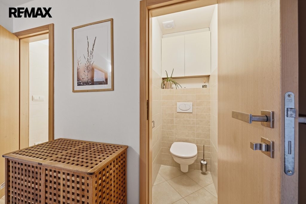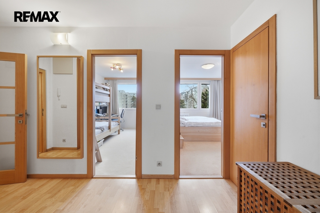 Dispozice bytu je velmi praktická a vzdušná. Kuchyň je elegantně propojena s obývacím prostorem, zároveň však zůstává částečně oddělena stěnou, což vytváří příjemné soukromí i čistou linii hlavního obytného prostoru. Místo původní komory byla chytře navržena vestavná skříň, díky které vznikla uprostřed bytu prostorná centrální hala s dostatkem úložného místa.Byt nabízí příjemnou orientaci na dvě světové strany — ložnice směřují na sever, zatímco obývací pokoj s lodžií je orientován na jih, což přináší dostatek světla i příjemnou atmosféru během dne. Komfort bydlení dále zvyšuje klimatizace, kvalitně provedená koupelna, samostatné WC i funkční kuchyň.