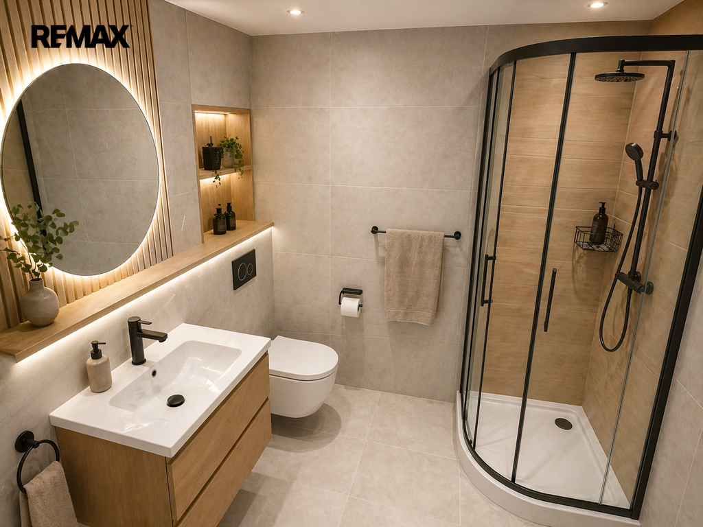 Obě ložnice mají vlastní koupelnu, hlavní ložnice navíc menší šatnu. Byt nabízí nadstandardní množství úložných prostor v podobě vestavěných skříní.