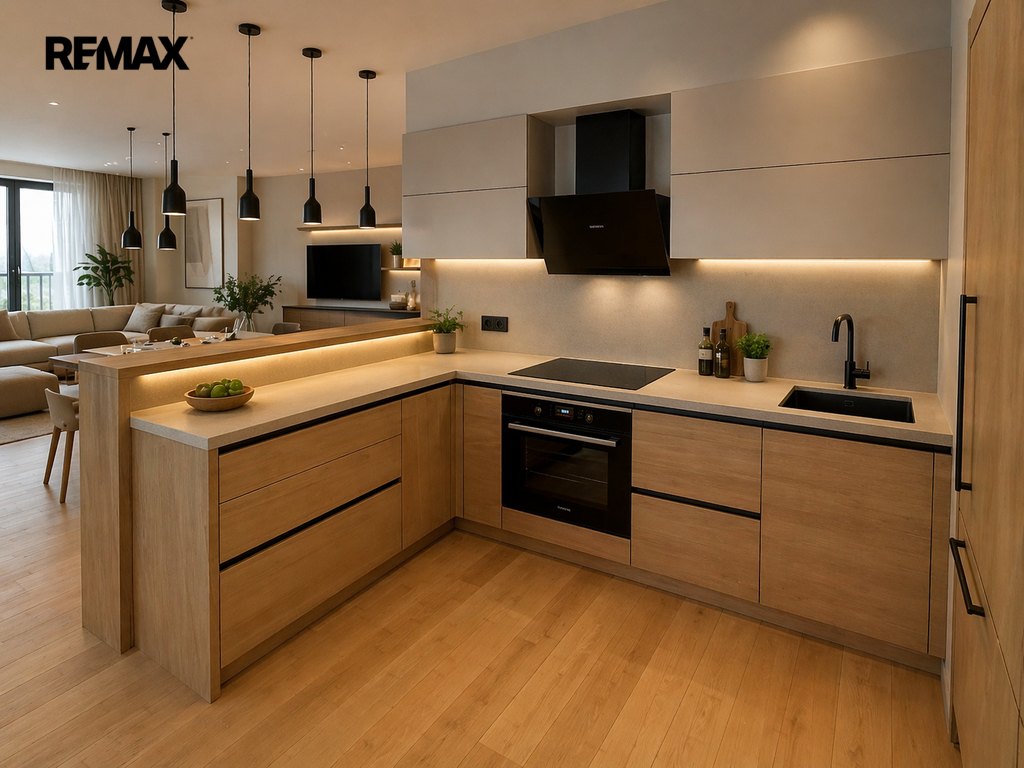 kuchyňská linka na míru s barovým pultem a designovým osvětlením