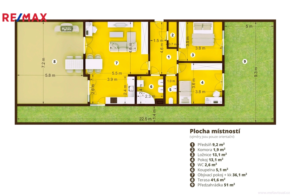 Byt, který má prostorný obývací pokoj s otevřeným a kompletně zařízeným kuchyňským koutem o celkové výměře 36,10 m2 se vstupem francouzskými okny na západně orientovanou terasu 41,60 m2, ložnici 13,10 m2 a dětský pokoj 13,10 m2 s východní orientací a vstupem na vlastní předzahrádku 51 m2, předsíň 9,20 m2, koupelnu 5,10 m2 s vanou, dvěma umyvadly a prostorem pro pračku a sušičku, samostatné WC 2,60 m2, komoru 1,90 m2 v bytě, plastová okna a na podlahách dřevěnou podlahu a dlažbu, se nachází v 1. NP z 5. NP žádané novostavby obytného komplexu VÝHLEDY – SUCHDOL společnosti CENTRAL GROUP a.s. z roku 2006, v ul. Holubí, v klidné západní části MČ Praha – Suchdol.