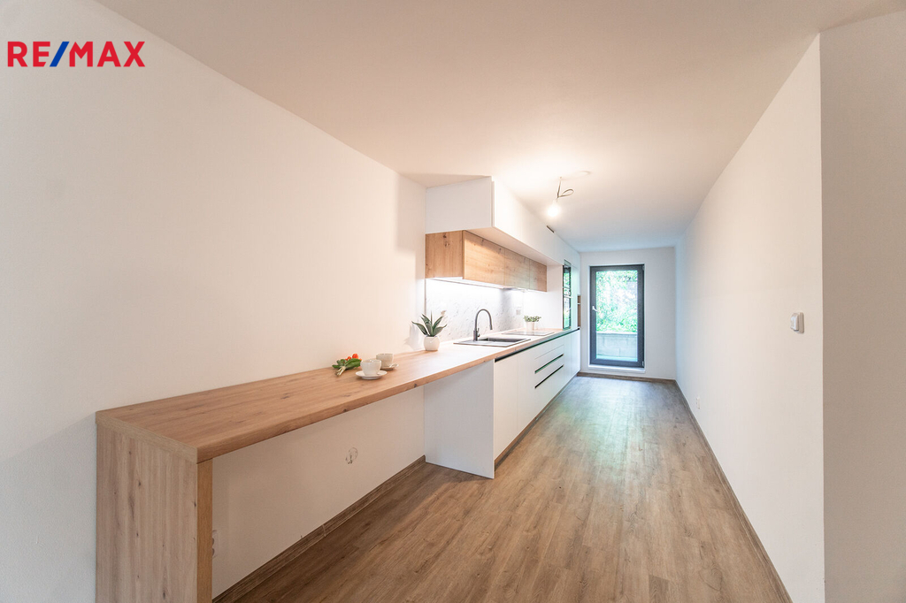 Na obývací pokoj navazuje kuchyň s moderní kuchyňskou linkou s vestavěnými spotřebiči - pečící troubou, sklokeramickou deskou i mikrovlnnou troubou a samozřejmě myčkou. Jistě vás potěší dostatek místa pro kulinářské umění i uložení potřeb. A nechybí zde ani snídaňový ostrůvek.