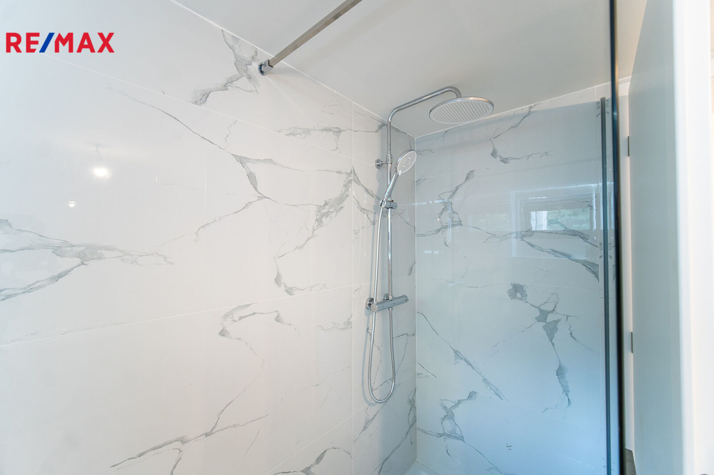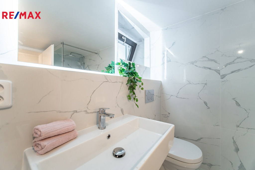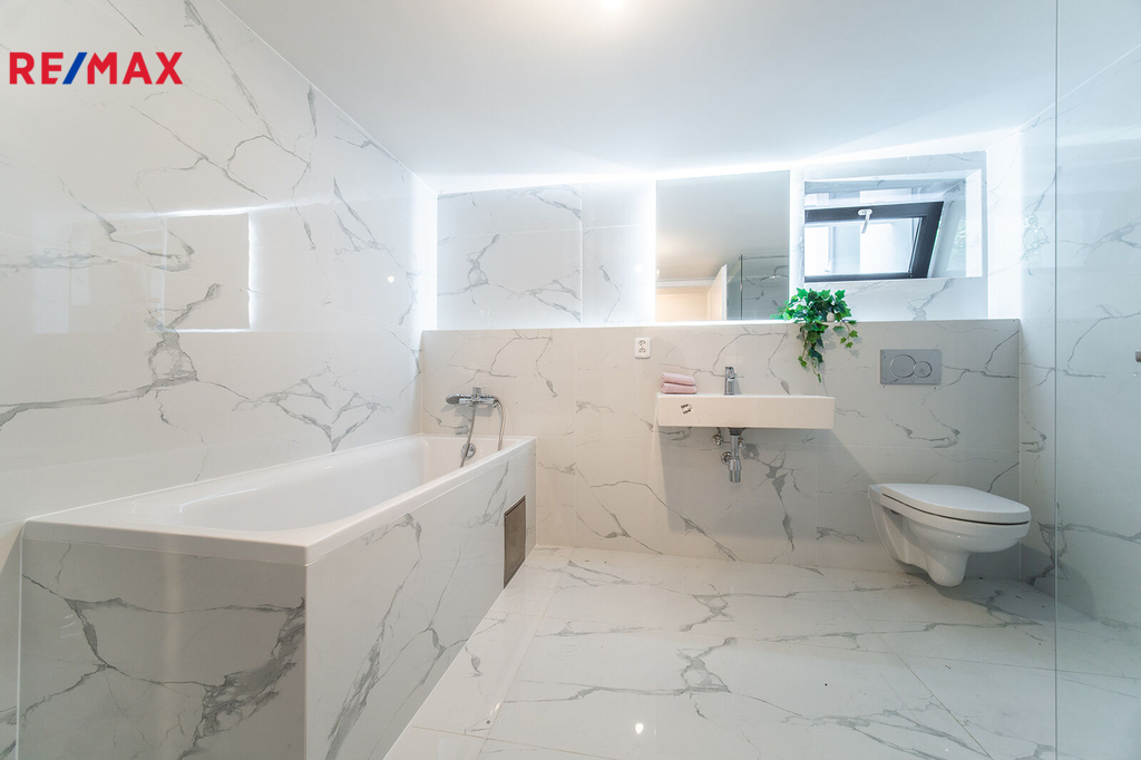 Designově moderní koupelna vás nadchne! Obklady i dlažba jsou v designu mramoru, osvětlení zrcadla, vana i velký sprchový kout s moderní sanitou jen doladí pocit luxusu a pohodlí.
