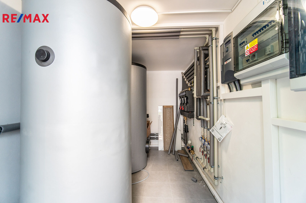 Vytápění je řešeno výkonným tepelným čerpadlem, ve všech místnostech optický kabel, na podlahách vinyl, tříkomorová plastová okna.