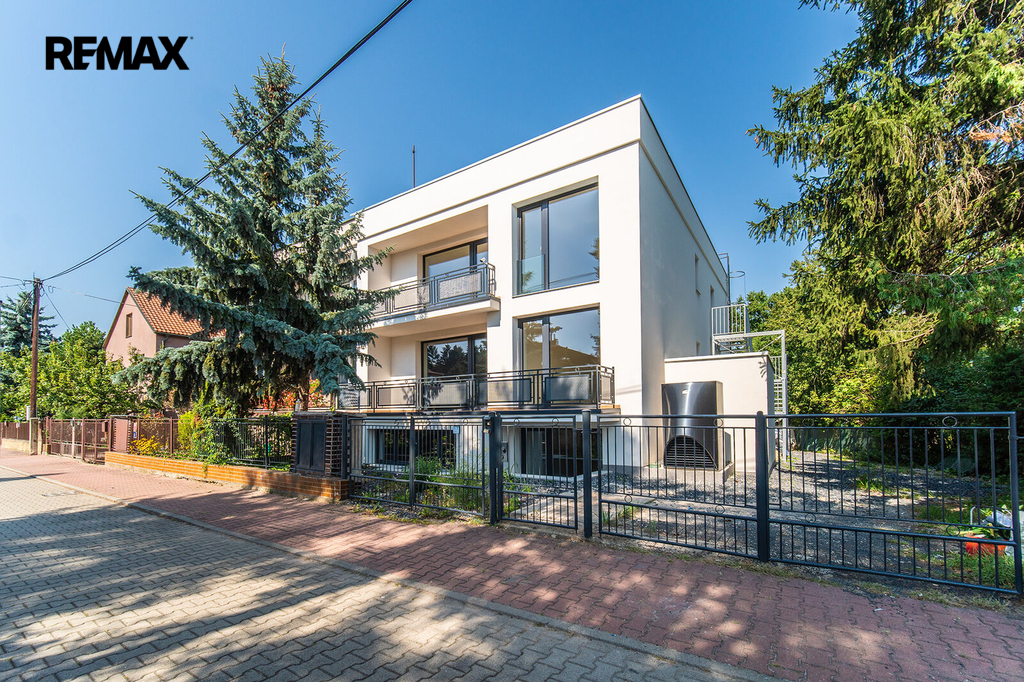 Designový byt o ploše 114 m² se zahradou a vlastním vstupem je součástí celkově moderně zrekonstruovaného rodinného domu se třemi jednotkami v klidné rezidenční části Dolních Měcholup.