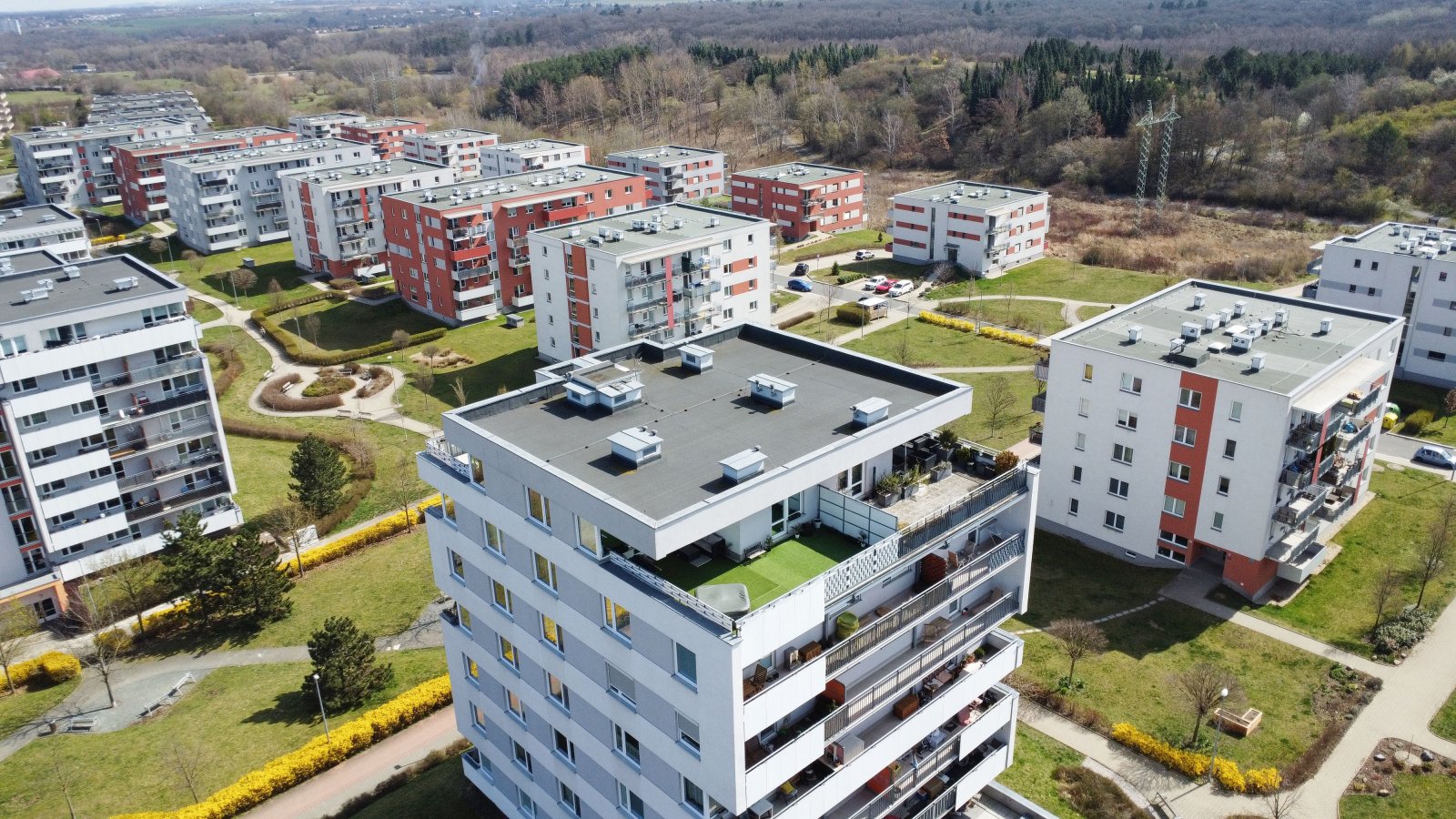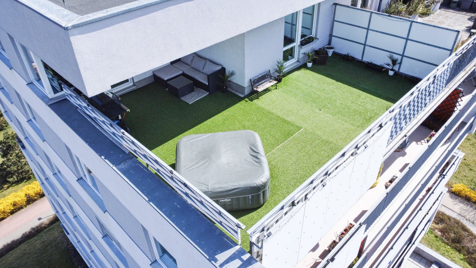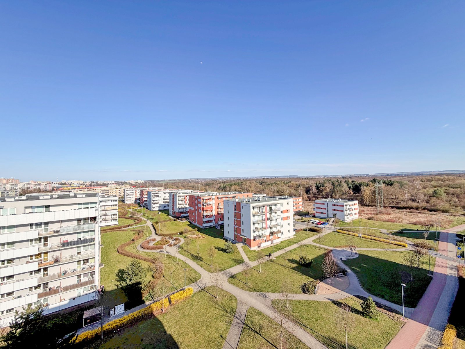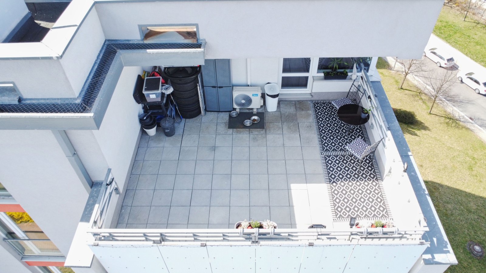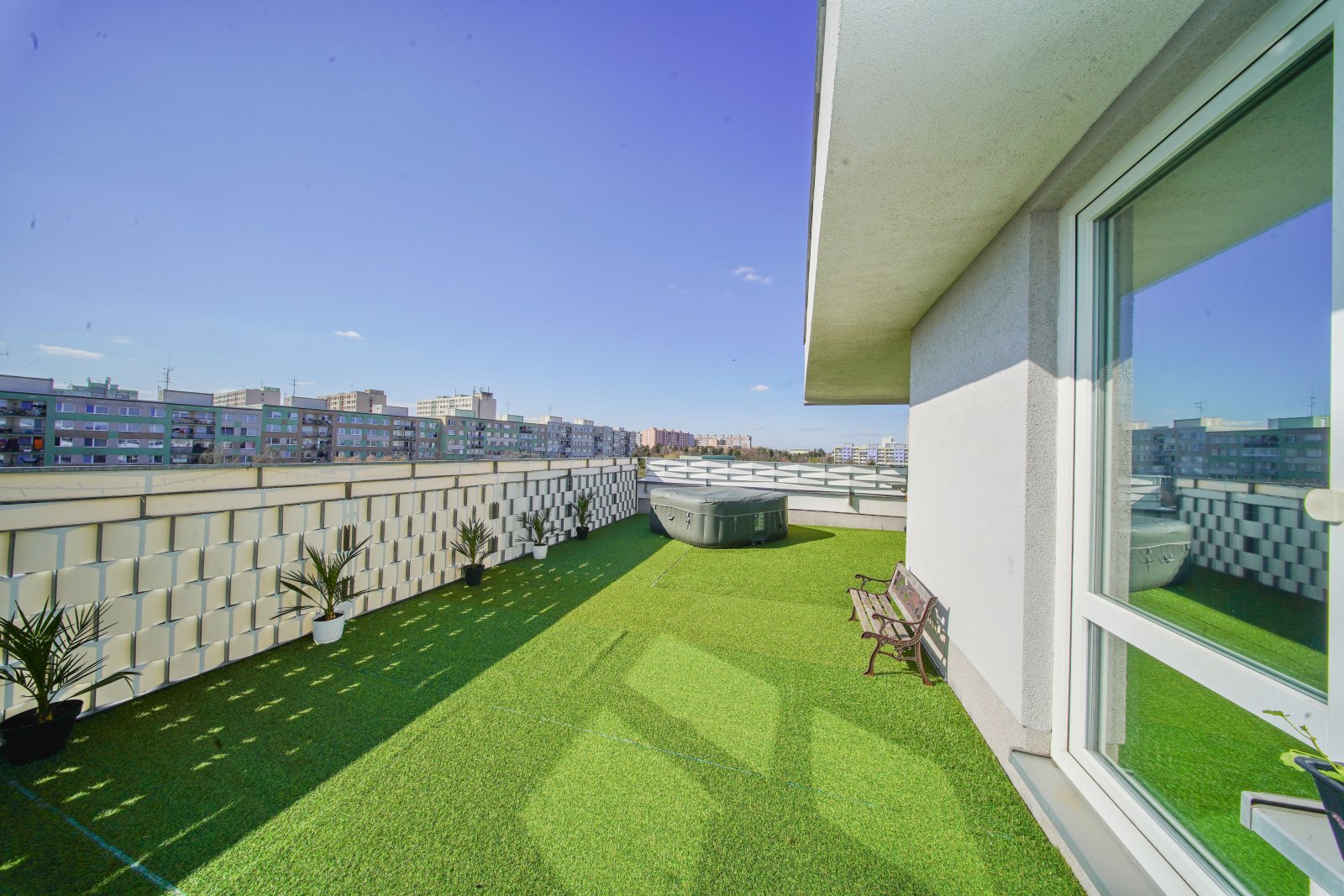 Dominantou bytu jsou prostorné terasy s výhledem na Milíčovský les, Kateřinky a Jižní Město. Západní terasa 46 m2 (z toho cca 11 m2 zastřešená), východní terasa 24 m2.