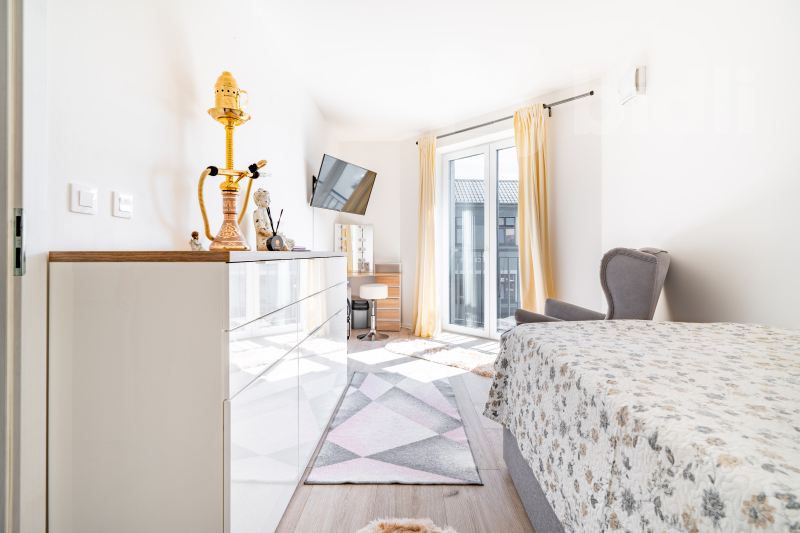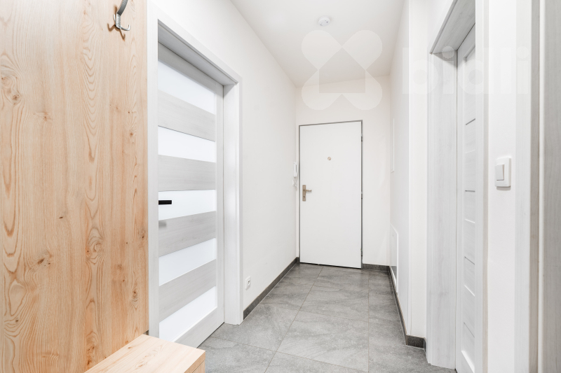 Interiér bytu je vybaven moderní kuchyňskou linkou včetně vestavných spotřebičů, prostornou šatní skříní, v koupeln podlahovým vytápěním s možností regulace a předokenními žaluziemi, které zajišťují optimální soukromí a tepelný komfort. V bytě je dále nainstalována rekuperační jednotka, která se postará o stálý přísun čerstvého vzduchu.