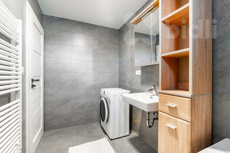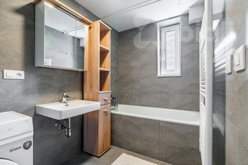 Koupelna je laděná do elegantních tónů šedé s velkoformátovým keramickým obkladem, který dodává prostoru nadčasový a luxusní vzhled. Součástí vybavení je vana s obdélníkovou linií, ideální pro relaxaci po náročném dni, topným žebříkem a velkou výhodou této koupelny je okno s otvíráním, které zajišťuje přirozené denní světlo a možnost rychlého odvětrání - díky tomu je prostor svěží a bez zbytečné vlhkosti i bez nutnosti použití ventilace.