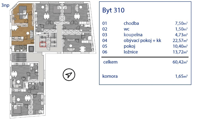Tato bytová jednotka vznikla v rámci komorního developerského projektu o celkem 15 bytech, kolaudovaného v roce 2023. Součástí nabídky je vlastní venkovní parkovací stání ve vnitrobloku a také praktická komora o ploše 1,5 m², umístěná přímo na patře vedle bytu.
