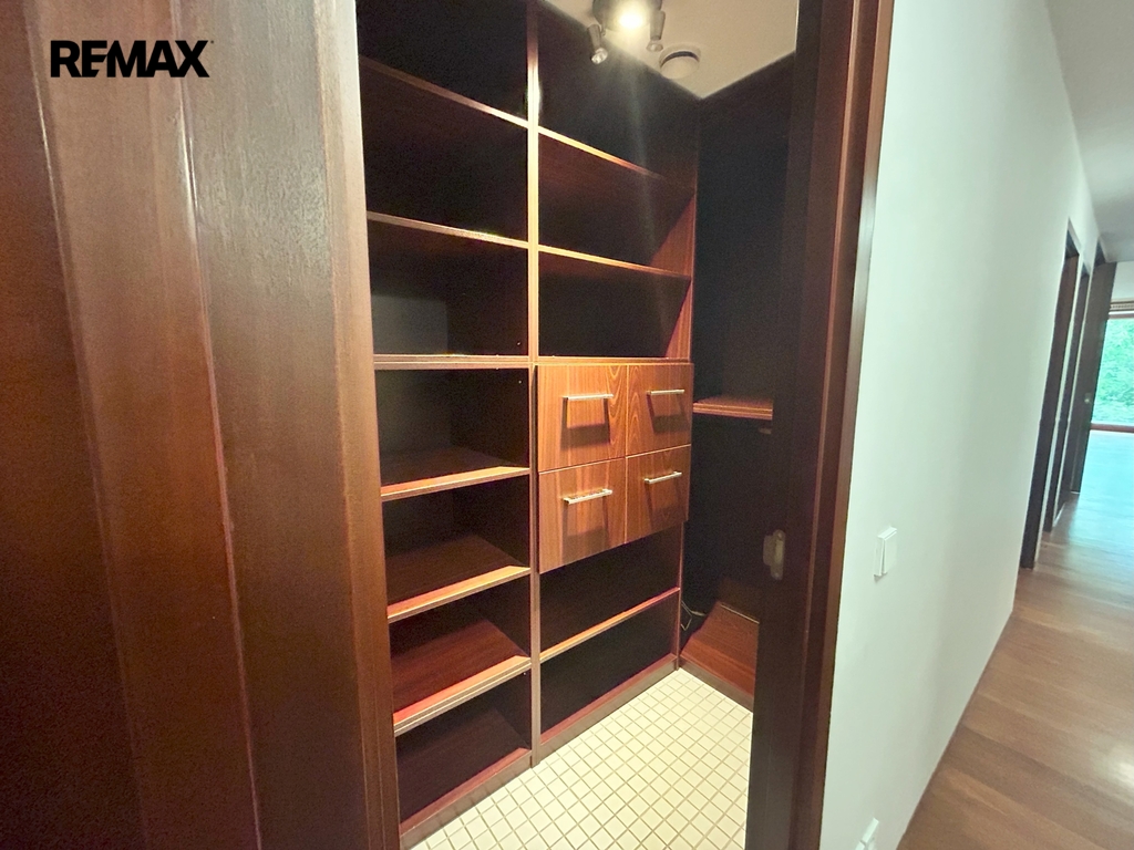 Největší z pokojů disponuje dvěma vstupy - z chodby a obývacího pokoje. Prostor mezi kuchyní, chodbou a obývacím pokojem nabízí flexibilitu díky velkým posuvným dveřím až ke stropu, umožňujícím oddělení či propojení prostor. Kuchyně je zhotovena z kvalitních materiálů s pracovní deskou z přírodního kamene. V koupelnách byly také použity kvalitní přírodní materiály.