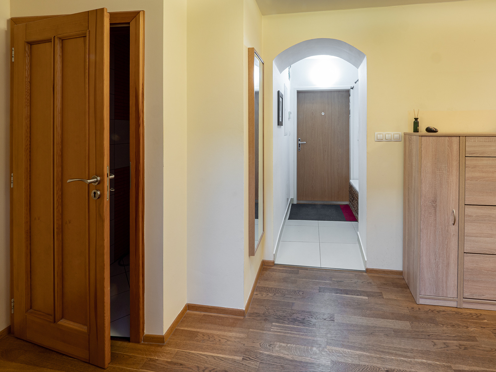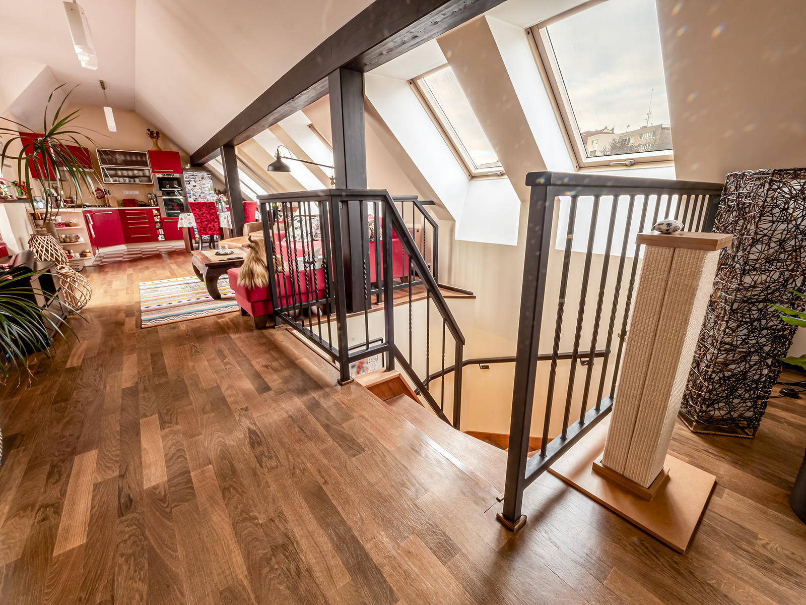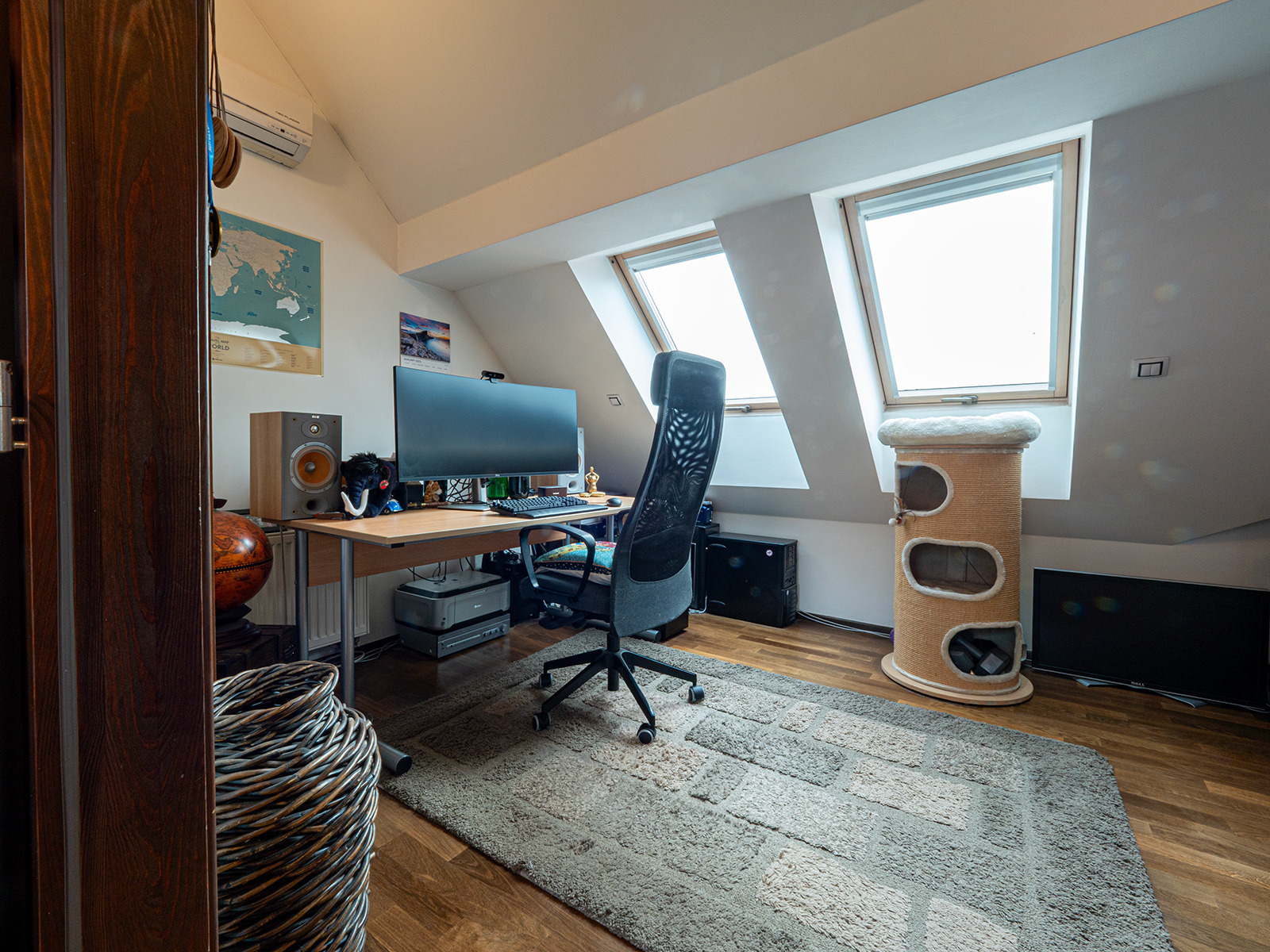 Mezonetový byt o rozloze 125 m² se nachází ve 3. a 4. p. domu bez výtahu. Z obývacího pokoje je přístup na terasu o rozloze 39 m², která je orientovaná do klidného vnitrobloku. Celková užitná plocha bytu je tedy 164 m². V místnostech je dřevěná podlaha, u kuchyňské linky je dlažba. V bytě je koupelna a dvě samostatná WC. Orientace obývacího pokoje s k.k. je S+J, ložnice jsou na S. V bytě je klimatizace, internetové připojení optickým kabelem a v předsíni velká vestavěná skříň. Topení zajištěno plynovým kotlem Protherm. K bytu náleží 2 komory a sklep. Kolaudace bytu byla v roce 2008.