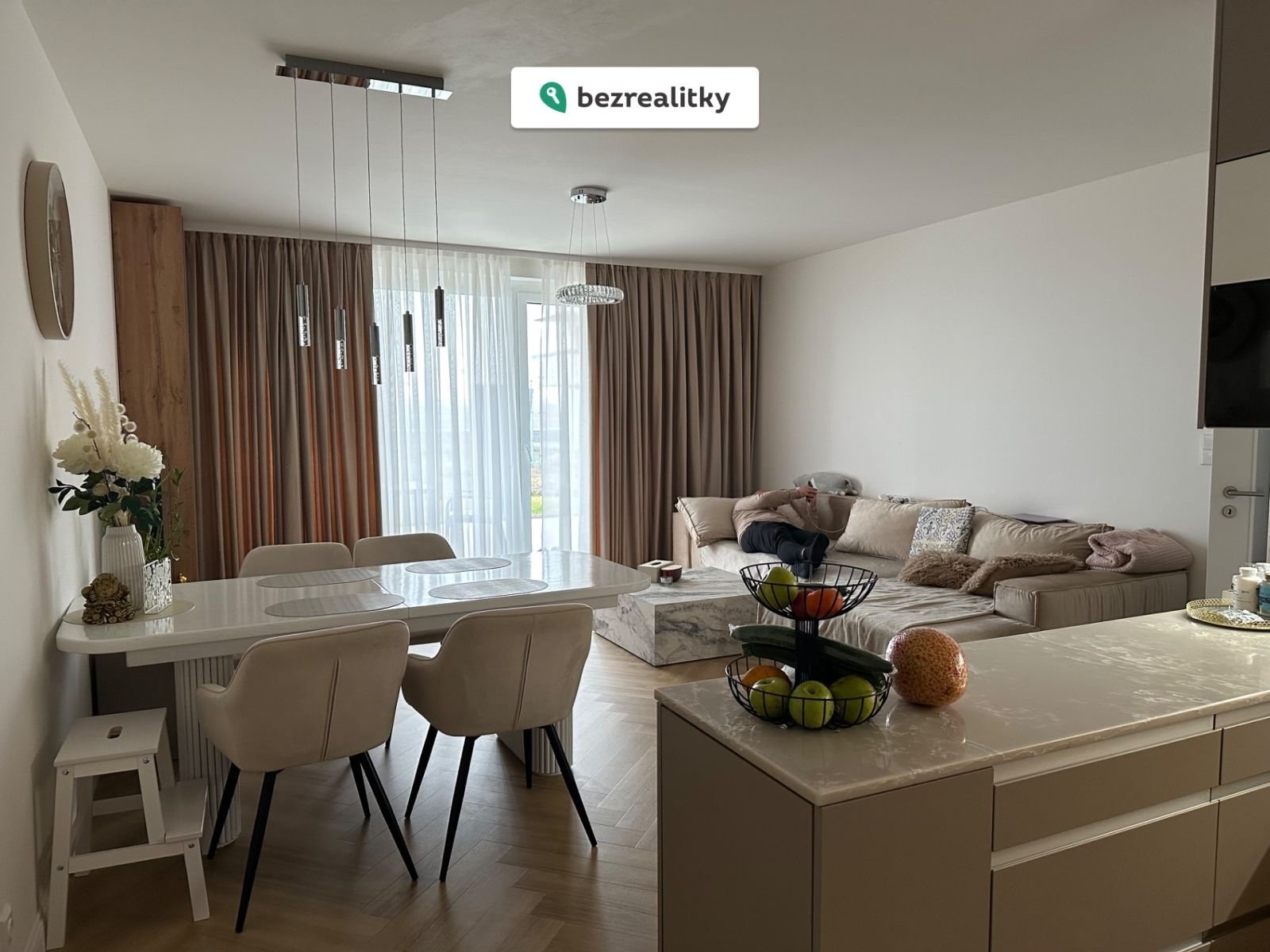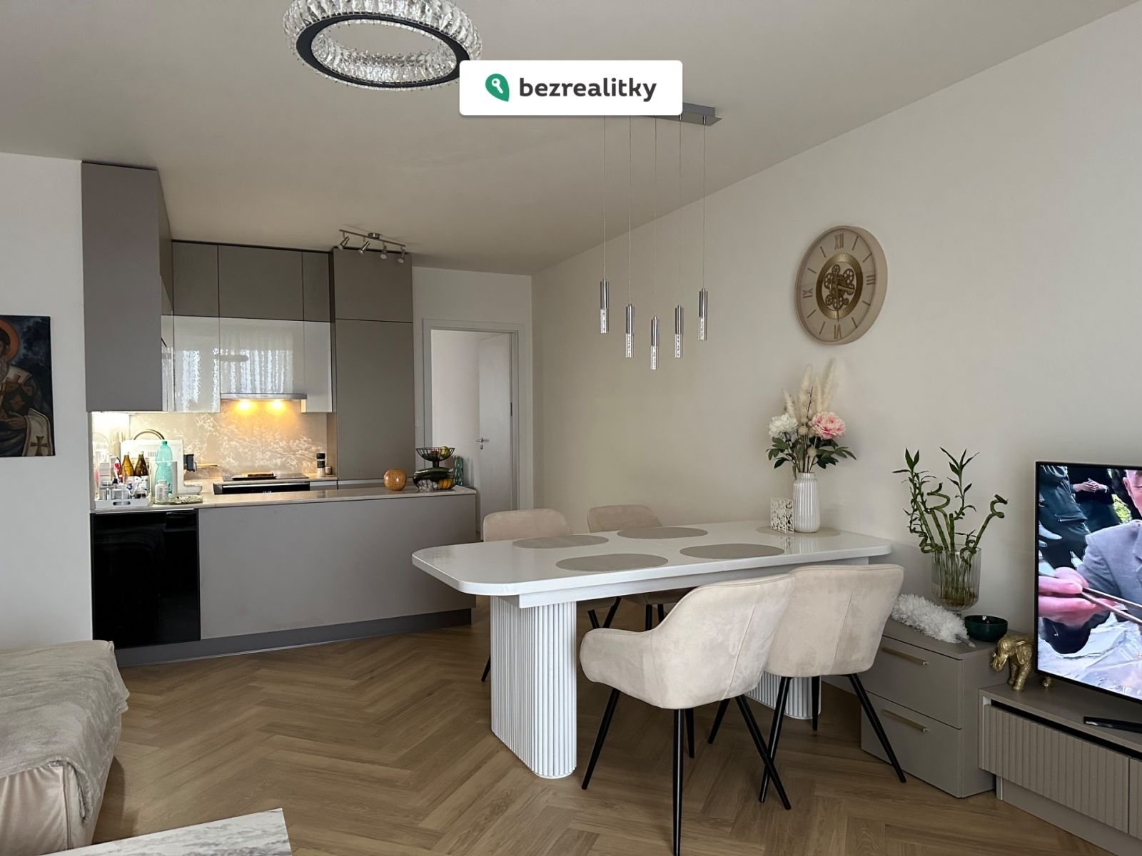 Byt se prodává kompletně vybavený – moderní kuchyňská linka s křemennou pracovní deskou a spotřebiči, vinylové podlahy, vestavěné skříně a kvalitní nábytek. Stačí se jen nastěhovat.