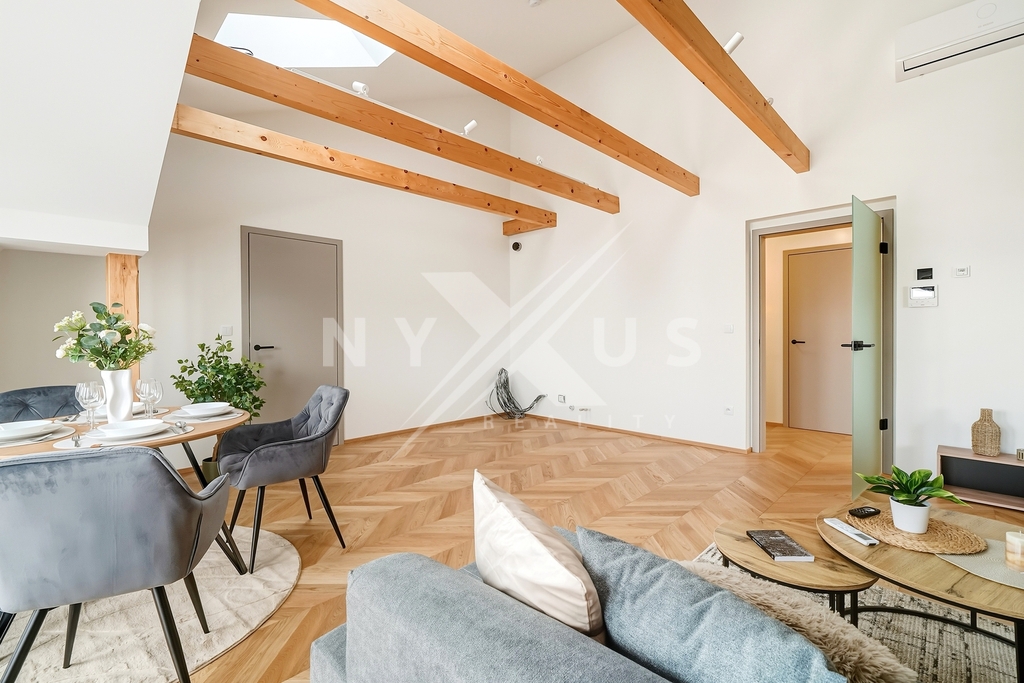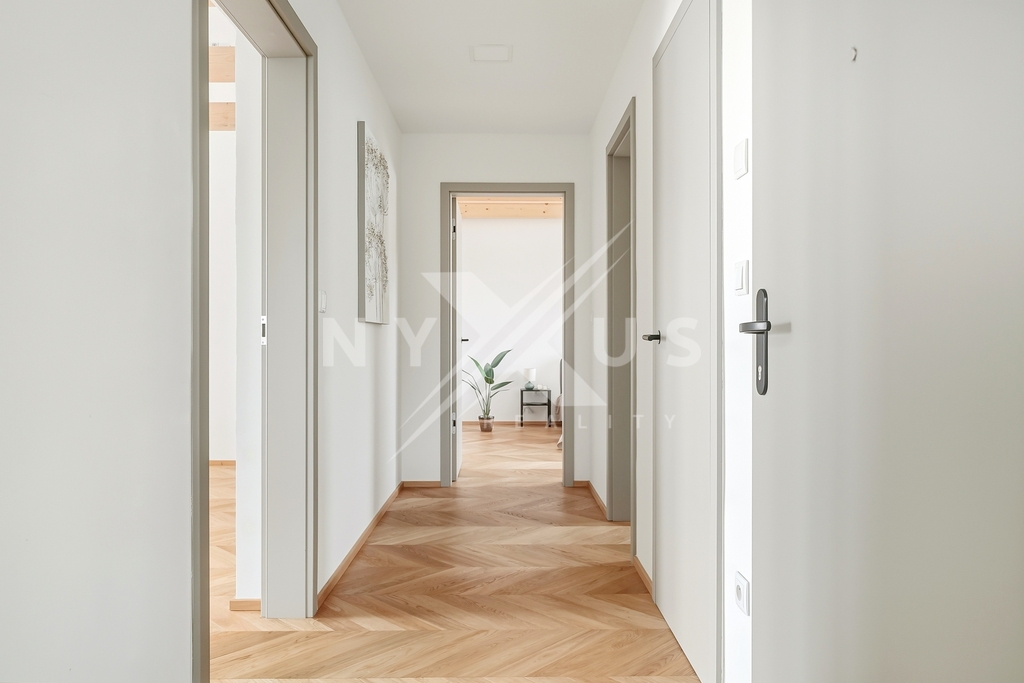 Byt je řešen s důrazem na pohodlí i funkčnost. Dominantou je otevřený obytný prostor s kuchyňským koutem a přímým vstupem na terasu. Dále jsou zde tři samostatné ložnice, koupelna s vanou, sprchovým koutem a toaletou, druhá toaleta oddělená a vstupní hala. K jednotce náleží také půdní prostor o velikosti 20 m², ideální pro uložení sezónních věcí či sportovního vybavení.