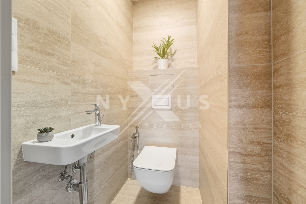 Interiér kombinuje moderní technologie s elegancí. Dubové podlahy ve vzoru chevron krásně navazují na historický charakter vily. Okna i terasové dveře s izolačními trojskly přispívají k výbornému akustickému i tepelnému komfortu. Koupelna je vybavena sanitou značek Villeroy & Boch a Hansgrohe, doplněnou velkoformátovými obklady od italského výrobce Casalgrande Padana. Interiérové designové dveře Vekra s magnetickým zámkem. O tepelný komfort po celý rok se stará podlahové vytápění a chlazení napojené na tepelné čerpadlo, ovladatelné přes mobilní aplikaci, v hlavních obytných místnostech jsou navíc klimatizační jednotky. Dům splňuje energetickou třídu B, což znamená nízké provozní náklady a vstupní dveře jsou bezpečnostní.